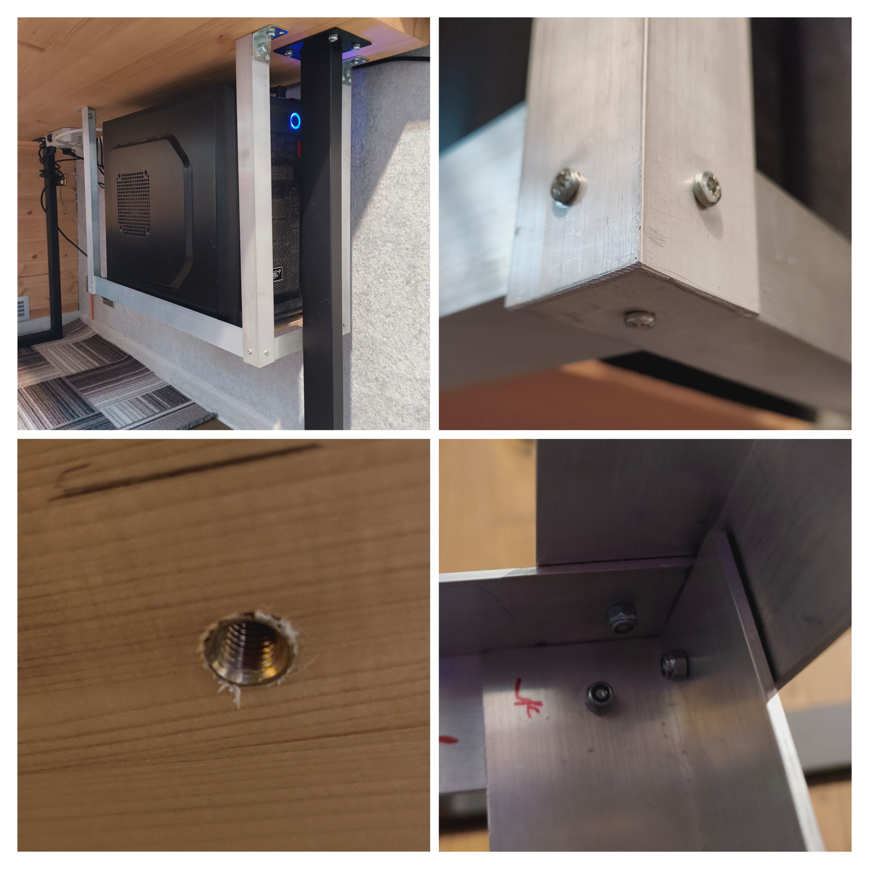 Keyco , когда у меня был sff рабочий системник, я его аналогично прикрутил снизу к столешнице, но он на ремнях тканевых висел. Вес небольшой, так что хватало. Снимать и назад навешивать было очень быстро - как удлинить ремешок на сумке или рюкзаке. Так что за реализацию для большого системника однозначно плюсую!