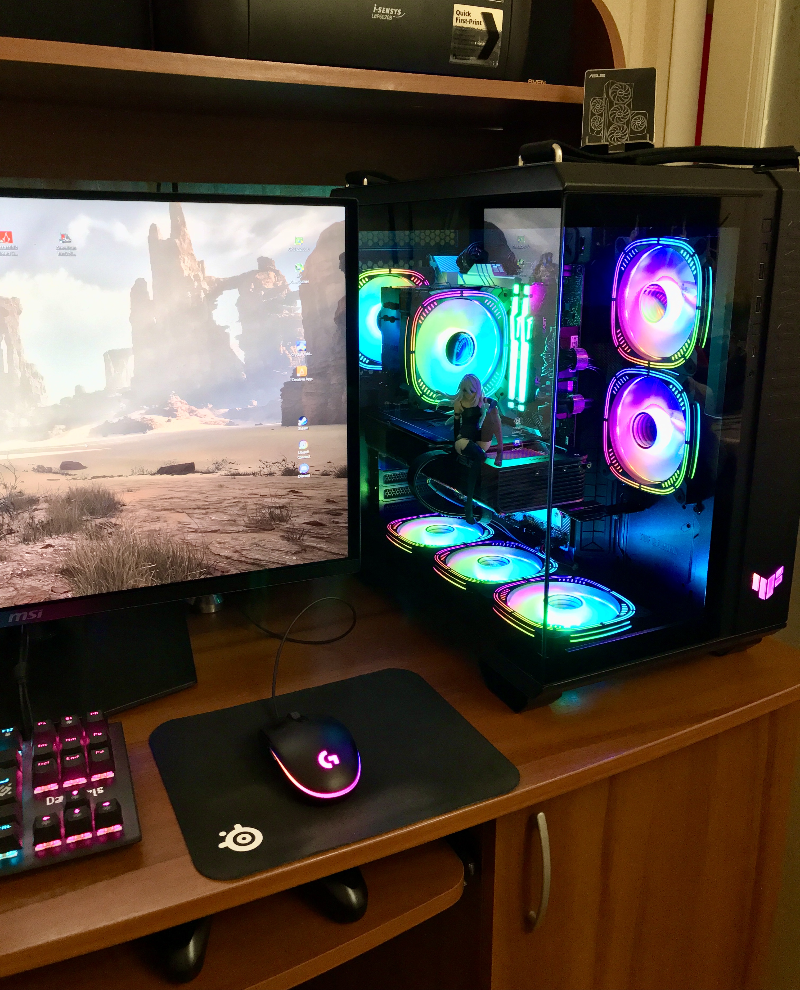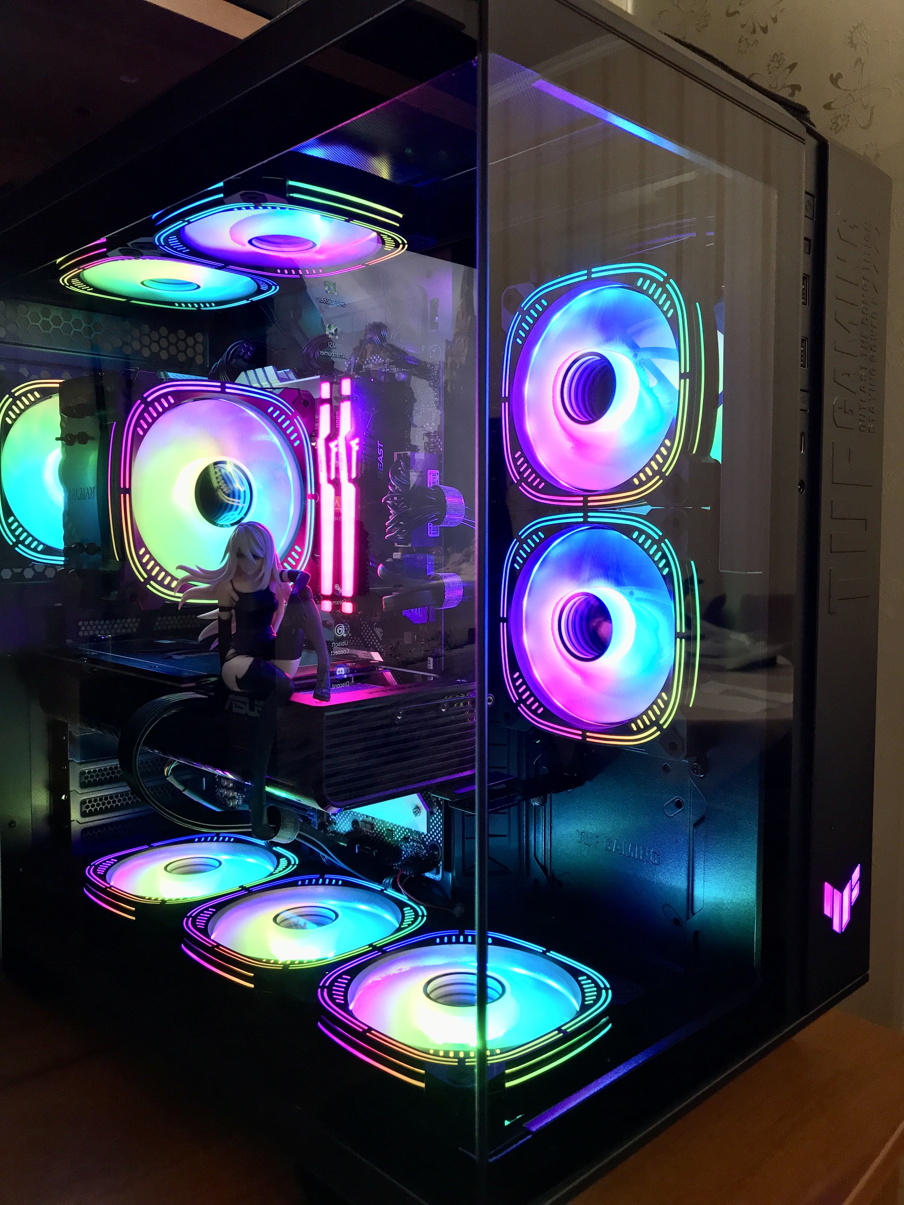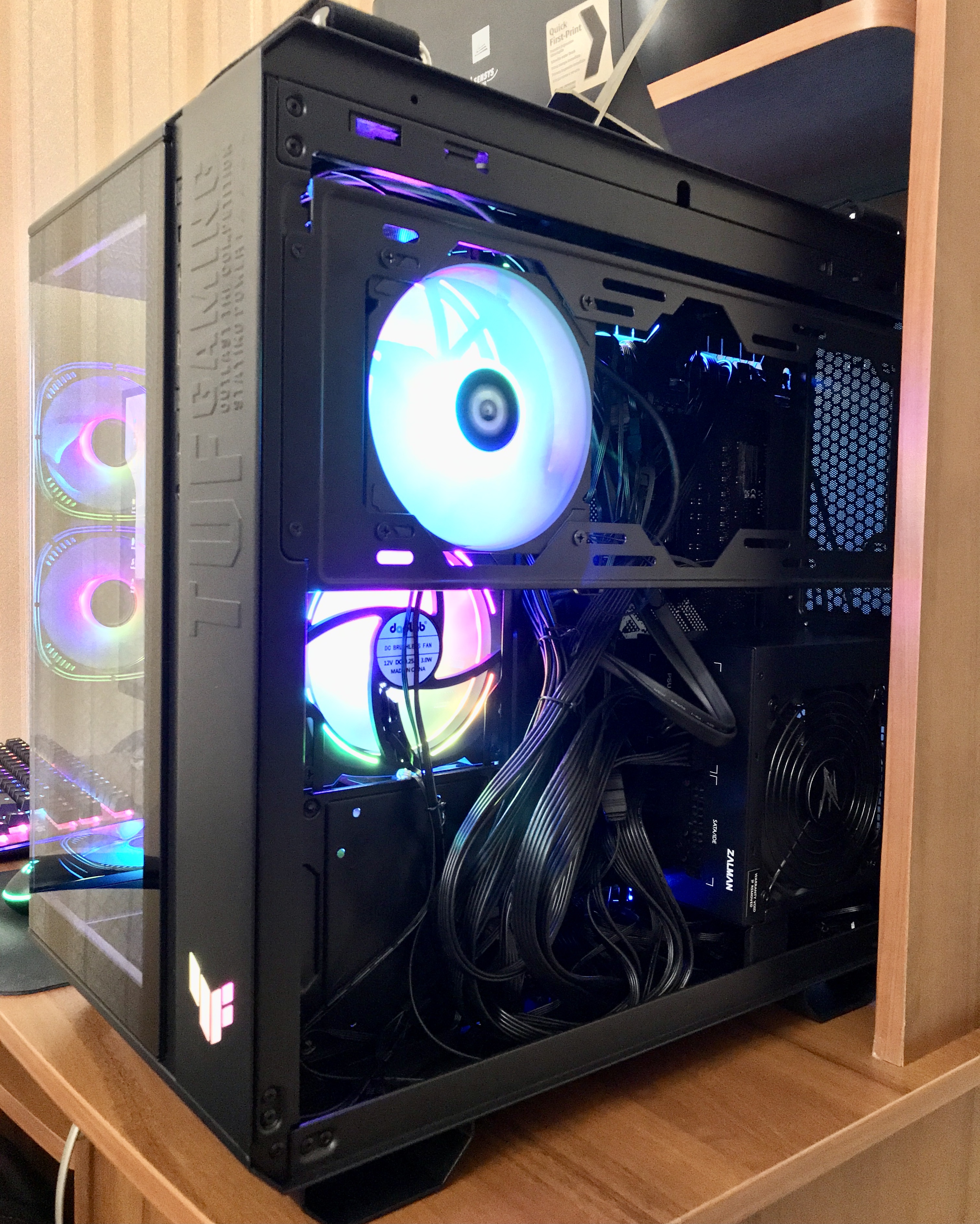 Ну вот, месяц ждал, подгадывал, и на выходных сейчас наконец пересобрал системник по современному фэн-шую как говорится, за просмотром сериалов Корпус восторг, снова крайне положительно убедился, что Асус есть Асус. А за копейки 14 т.р., оторвал, такой можно и за 30-ку взять не пожалеть. Уж на что разные корпуса были, и Асус раньше, Карсар, Гиги и Залманы. Но это сейф. Солидный, матовый, тяжелый, везде хороший металл, толстые съёмные стекла. Все удобно, доступно с внешки вручную, куча разного места, питание от видеокарты даже до стекла не касается, магниты (и функциональная магнитная подпорка под видеокарту с двумя насадками), герметичность фильтры по всему периметру, защелки, стекла вынимаются в металлических окантовках, по краям с затемнением, в итоге не переживаешь, что где то ударишь стекло\ставишь и пальцами залапаешь. Полноразмерный атх б\п влазит. Ну и ручки сверху, с крышкой на магнитах, офигенная конечно идея, просто ахово удобно перемещать такой сейф.