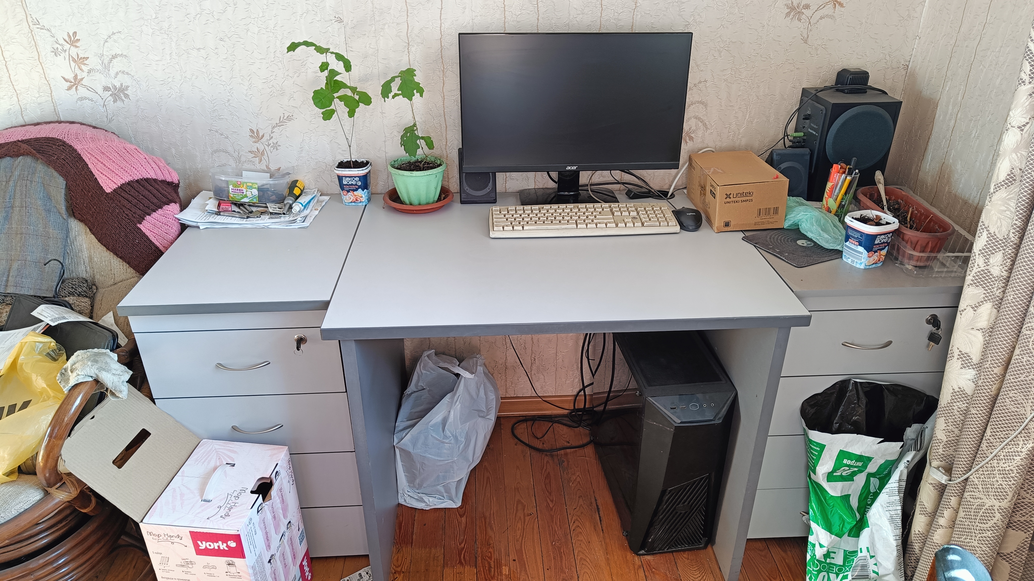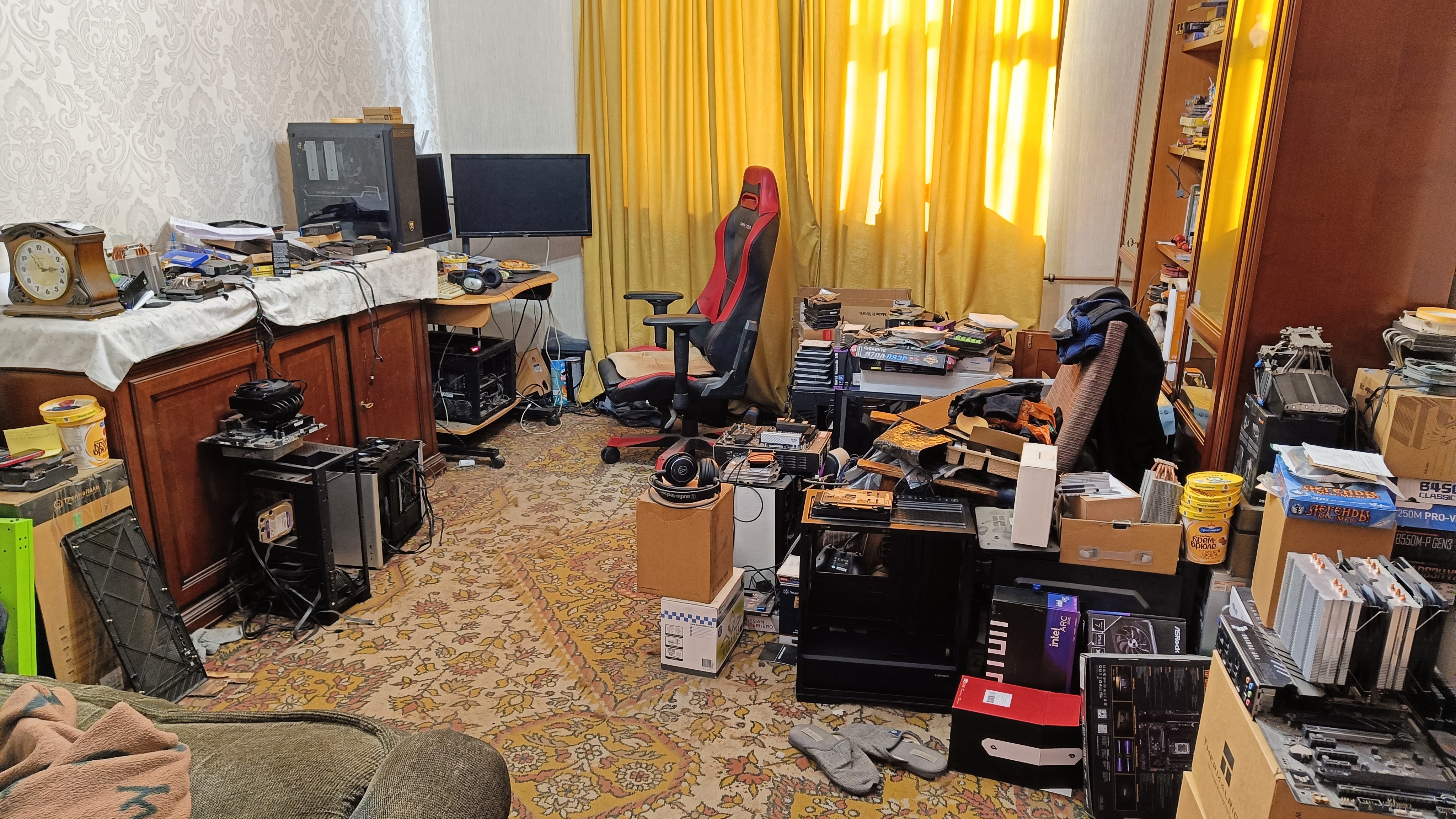 А вот так выглядит реальное рабочее место, на котором я постоянно собираю и ранее тестировал. "Срач", "Творческий Хаос" - это норма для таких рабочих мест, оно не для гламура/понтов - оно для кое-чего другого. Почему "тестировал" ? После страшной смерти моего ассистента от эпистатуса, 3 недели назад, все желание пропало. Да и настроя нет. Вот и решил очистить комнату - собрал 6 ПК на продажу.