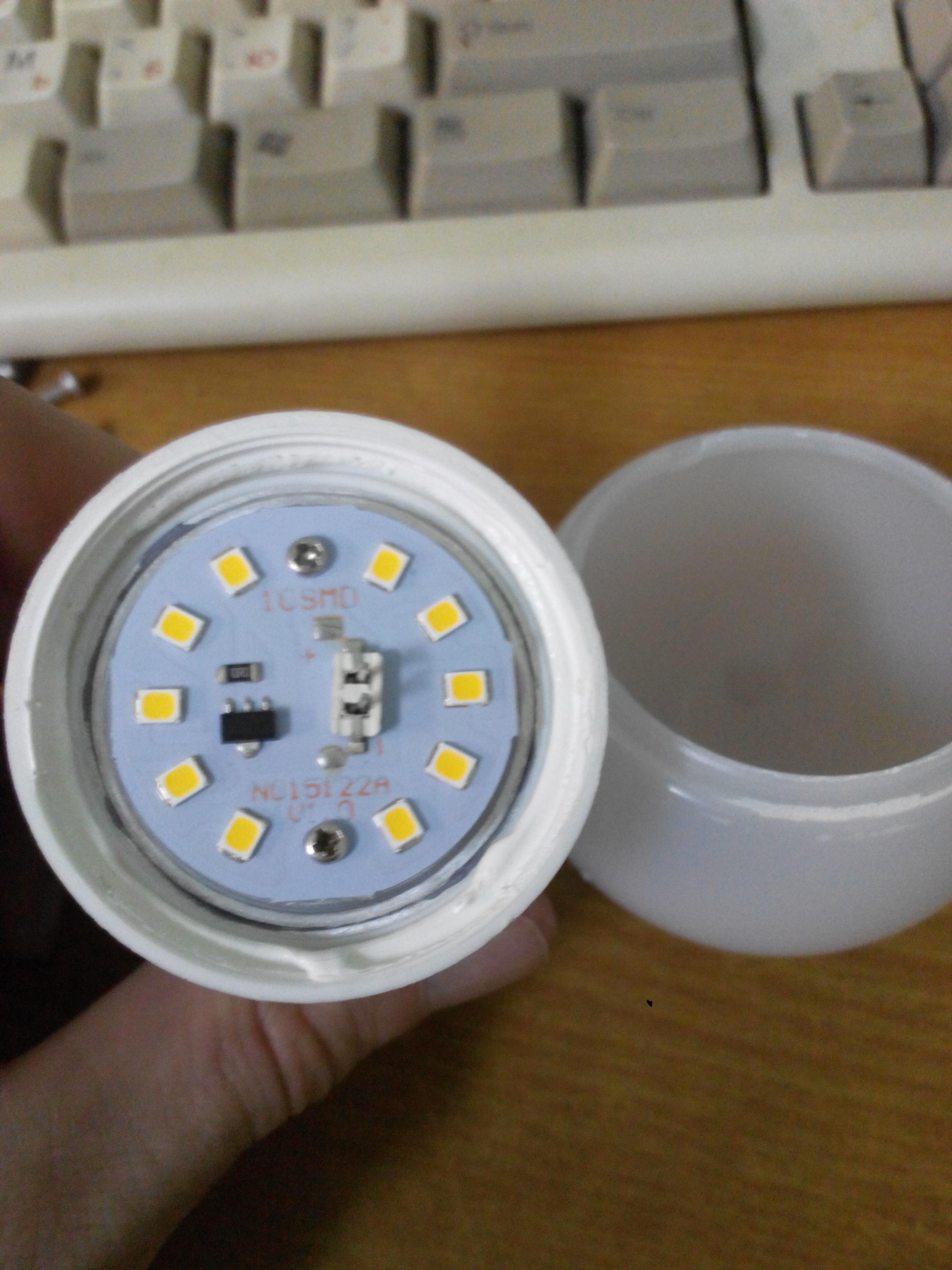 Имел дело с лампа дневного света и накаливания данной фирмы, ЛБ - часть вообще не загорелись, часть протянули месяца 3-4, после второй коробки я их все сдал в утилизацию, а накаливания могли сгореть сразу при вкручивании, но большинство входили из строя с отваливанием стеклянной колбы не протянув даже месяца. Купил пару лампочек Космос, заявлено 11Вт, цена 130р. Одна сразу не заработала, решил вскрыть, посмотреть. Как разобрать дальше? Под светодиодами алюминиевая часть не хочет вытаскиваться. И главный вопрос - светодиоды при проверке тестером не светятся, почему?