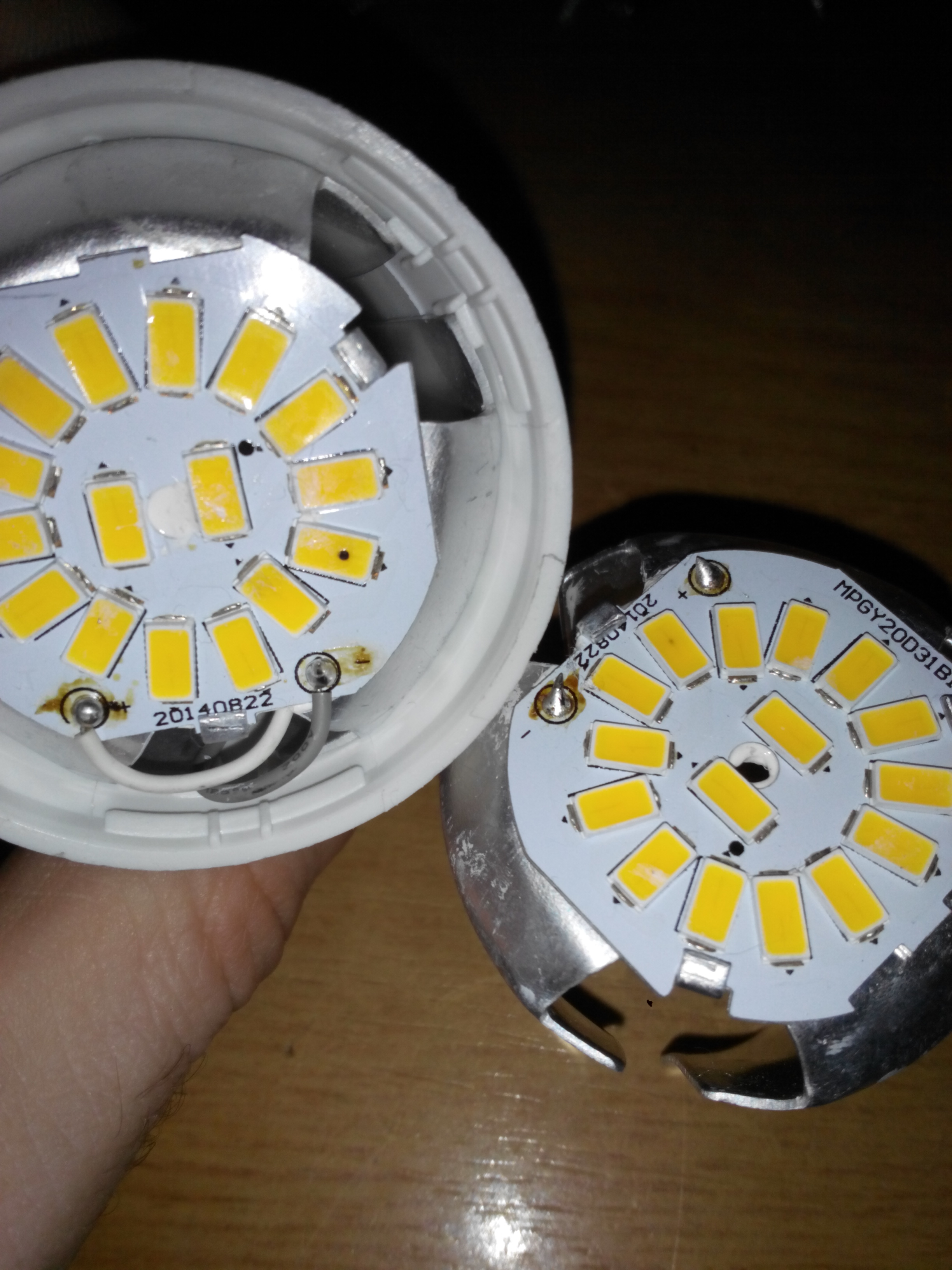 Я думаю да) Есть ещё пару ламп Старт 7W, так же разобрал посмотреть, тут пластиковая колба не приклеена, светодиоды на подложке, под ней даже термопаста есть) Только плату фиг достанешь, пришлось разламывать лампу. При проверке светодиоды светятся, правда не сильно, но всё же. Так удалось выявить в каждой лампе по 1 неисправному светодиоду, на фото с чёрной точкой.