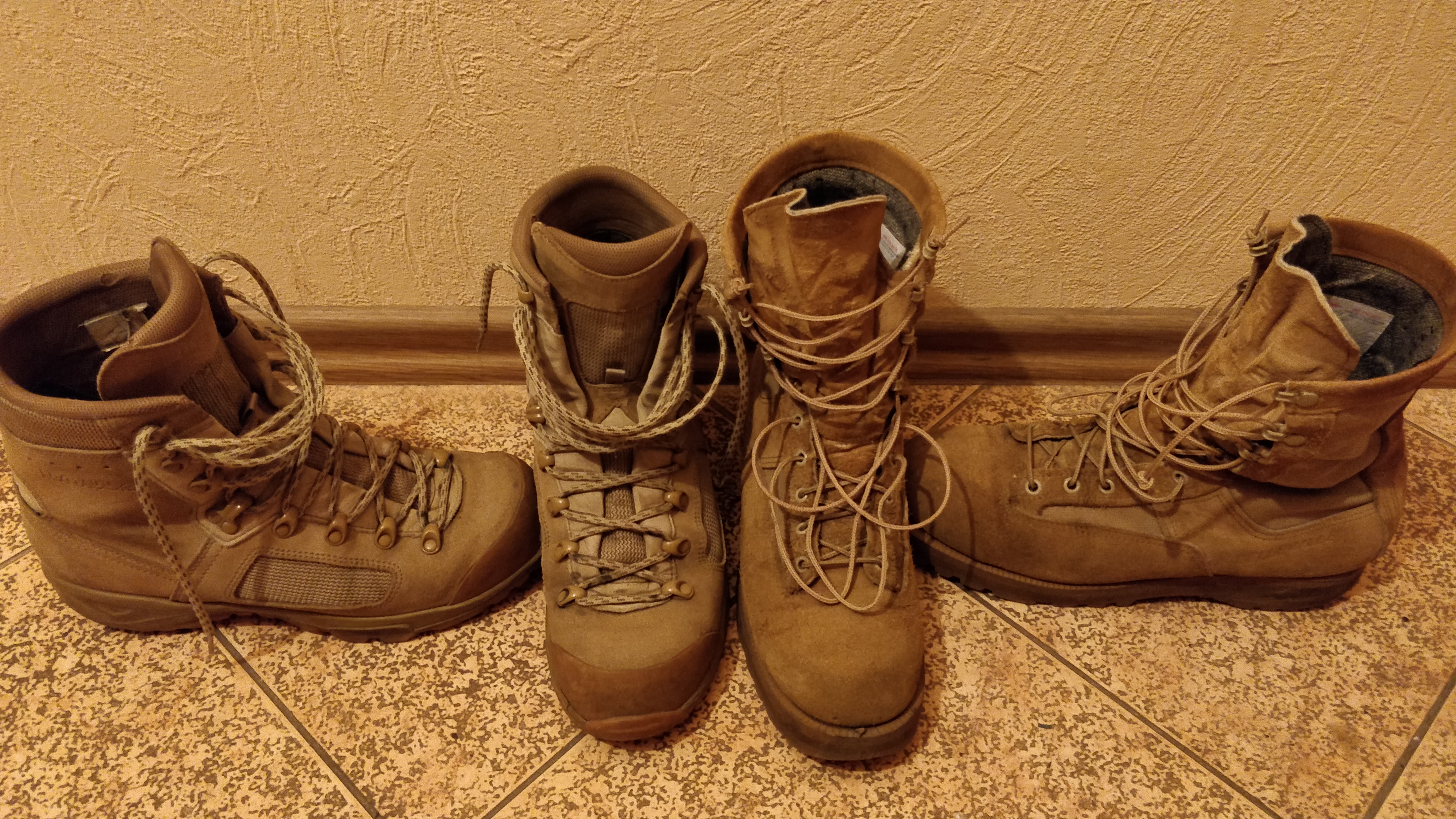Много лет покупал кроссовки адидас и всем устраивали, носились по 3-4 года. Но потом они стали делать какое то пластиковое говно, которое через год выкинул. Открыл для себя импортные берцы. На фотке Lowa Elite Desert (слева) и Belleville (справа), номер не помню. Lowa - летний вариант, комфортные как тапочки домашние. Пустынный вариант, так что без проблем носятся в жару. Belleville на весну/осень, т.к. они не промокаемые. Покупались на Ebay в США и Британии. Берцам больше 8 лет, т.к. покупал ещё до 2014 года по курсу 30 руб. Состояние близкое к идеальному, нигде ничего не порвалось. Всем рекомендую, но только везти из за границы, т.к. там существенно дешевле и нет подделок китайских.