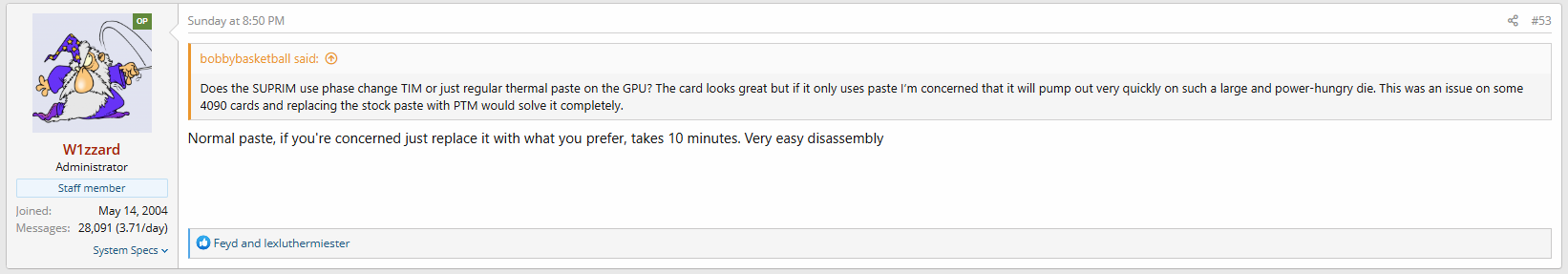 joint831 самое интересно то, что они у себя на стриме заявляли, что на Suprim серии будет использоваться фазовый переход, где было чётко видно на кульке его, который они показывали, а вот на обзоре того же TechpowerUp, там уже обычная термопаста.