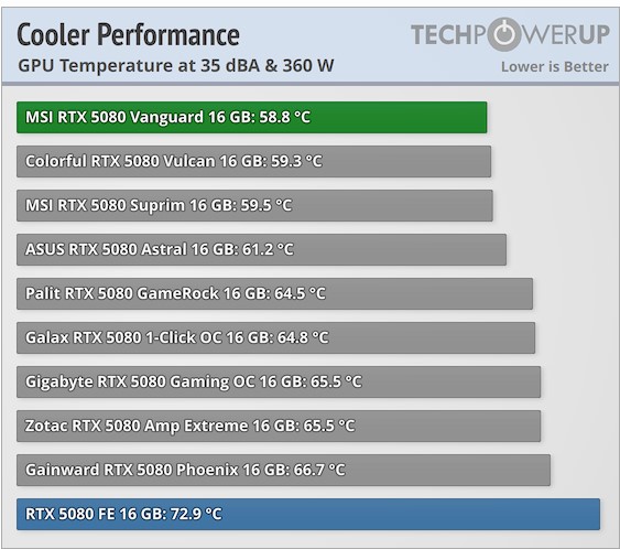 Короче судя по первым обзорам карт 5080 от партнеров, MSI Vanguard топ, самый холодный и тихий. Наравне, или даже опережает суприма. Жаль дешевые бомжеверсии никто не тестит все ринулись Астрал обозревать
