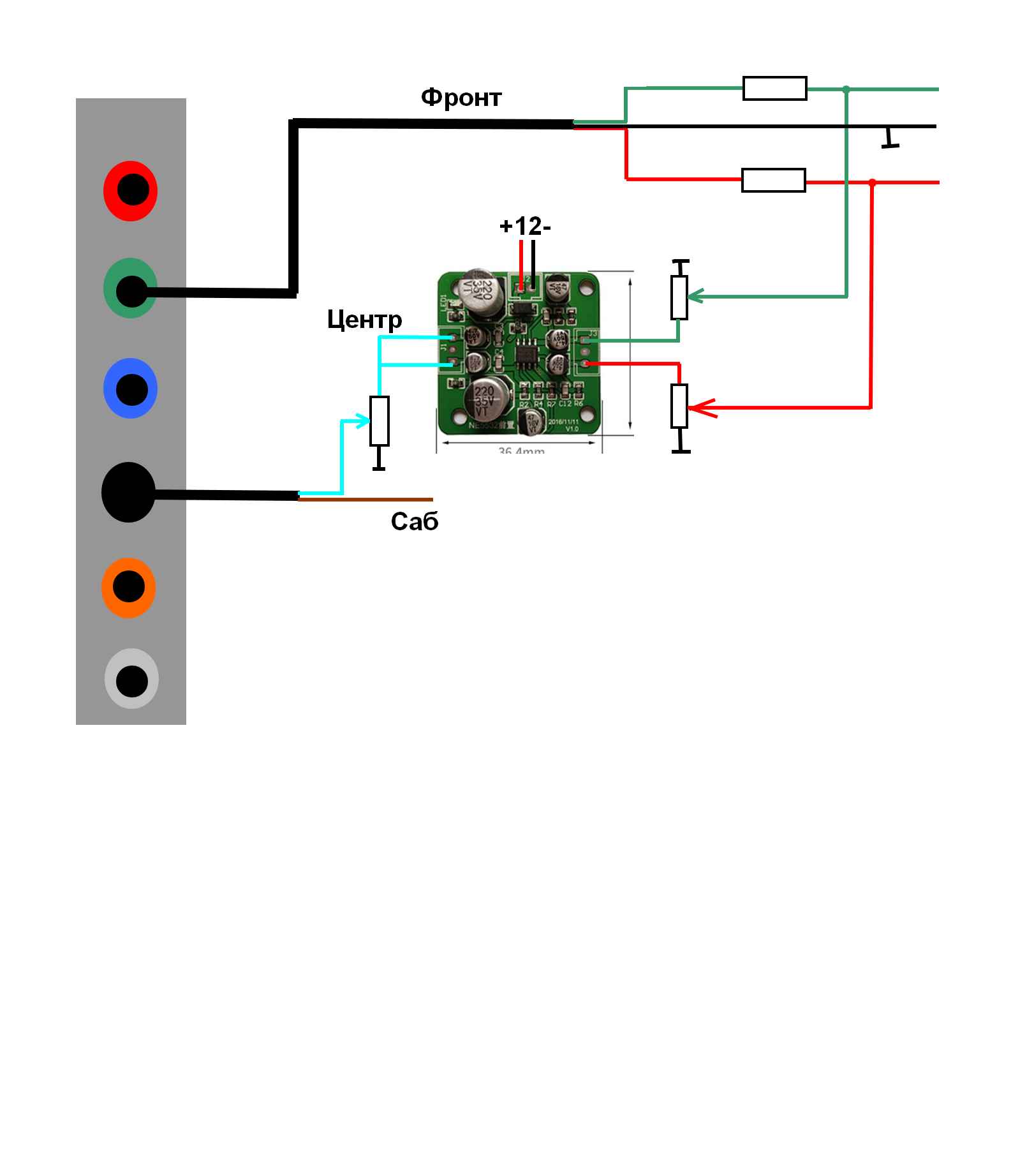 ЗлойГеймер вооо, это то, что надо, не думал что такое в принципе есть в готовом исполнении. Осталось это найти и заказать и подобрать резисторы. Пс ток черный это тыл, а оранжевый это центр-саб.