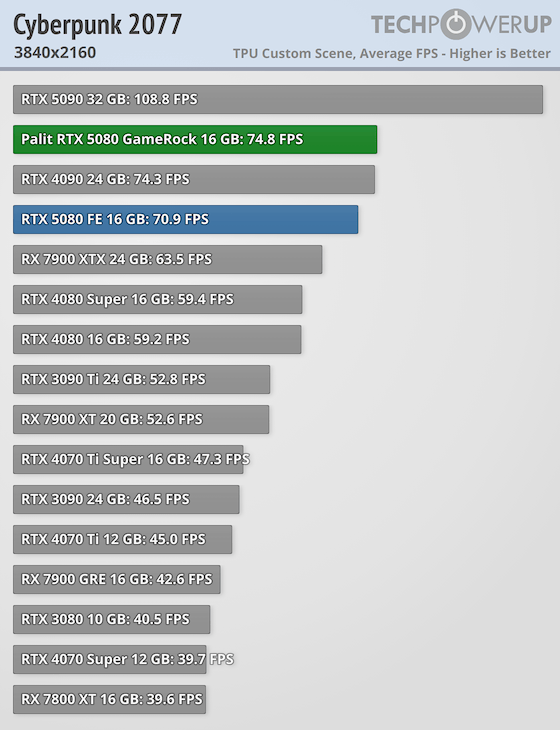 В среднем в РТ 5080 как и ожидалось = 4080+15%, но кто-то вбросил тест, где fps 5080 почти приблизился к 4090. Потом выяснили, что этот тест в нестандартной сцене и в настройках, в которых никто не играет, т.е. без РТ, но с ДЛСС, при этом фпс ниже чем у других с РТ.