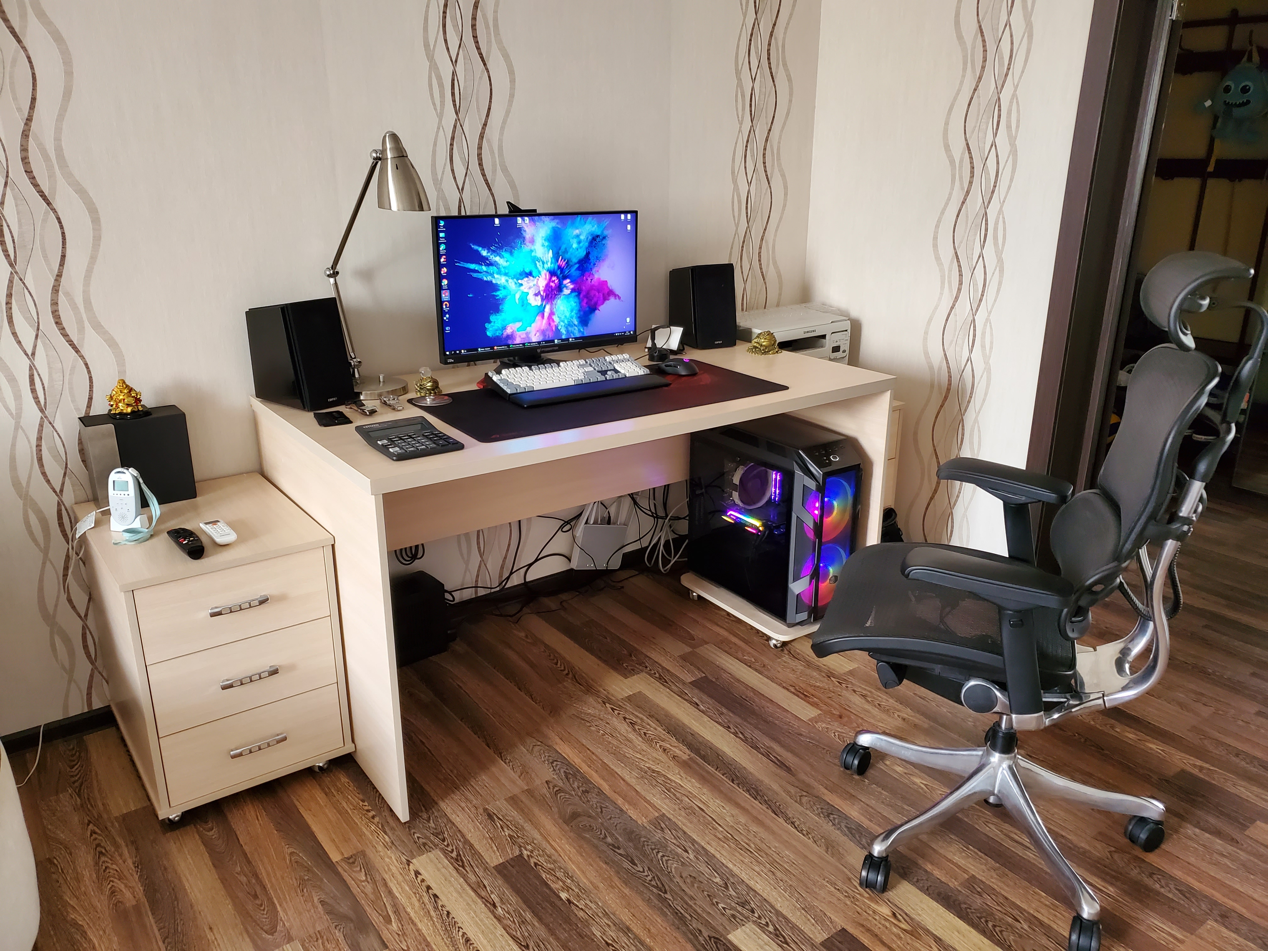 Сейчас вновь вернулся за стол, который сам сделал 7-8 лет назад, и это наверное самое удобное рабочее место Размеры стола: столешница 150см х80см, высота 80см и две тумбы на колесах, одна, при недостатке свободного места - спокойно закатывается под стол. зы: сорри за беспорядок проводов под столом, еще руки не дошли все окультурить.