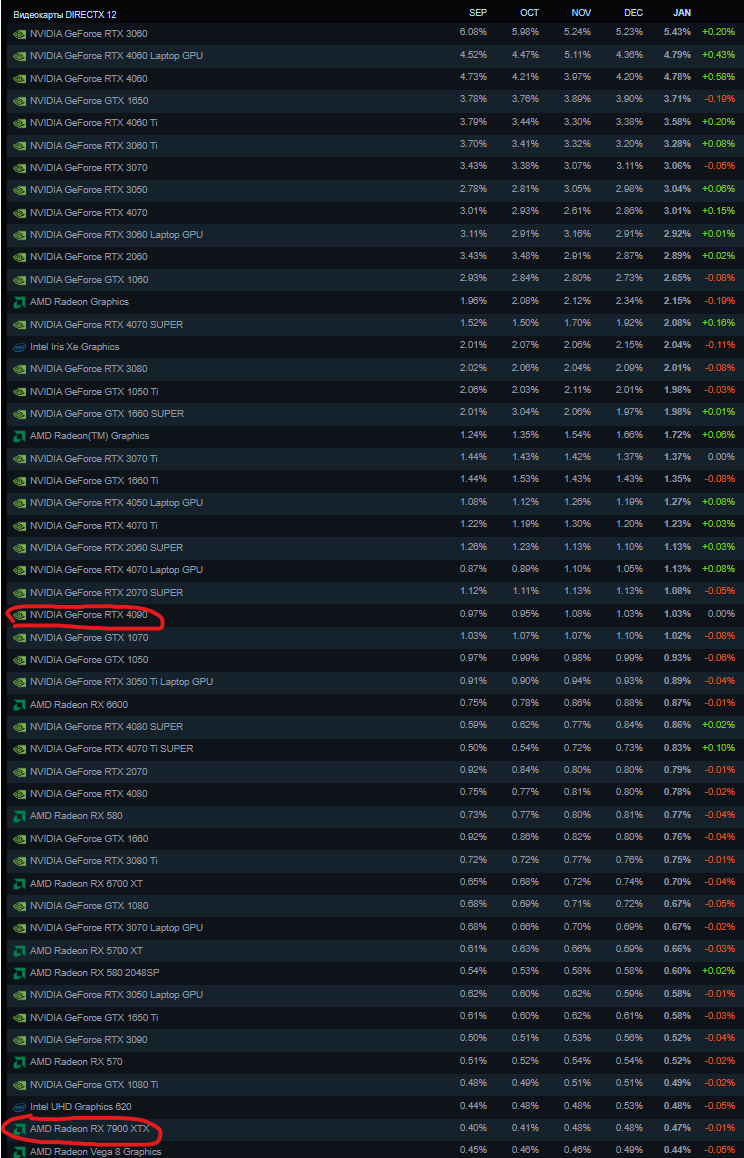 Нижняя строчка "Other". Там же к слову и 7900xt на пару с 7900gre Не, безусловно я согласен, что 6950xt и 3090ti были выпущены в конце жизни соответствующих линеек ВК и произведены мизерными тиражами. Прост забавно прозвучала фраза, что 7900 радеоны оказались массовыми))
