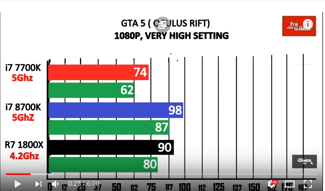 8700K 5Ghz vs 7700K 5Ghz и 1800X 4.2Ghz: https://www.youtube.com/watch?v=T77QTaLD5xI. Мне кажется 1800X только в играх смог на такой частоте работать, думаю тест LinX не прошел бы. Кстати, даже в 1440p разница между процами есть, без замера fps не заметная, но все же.