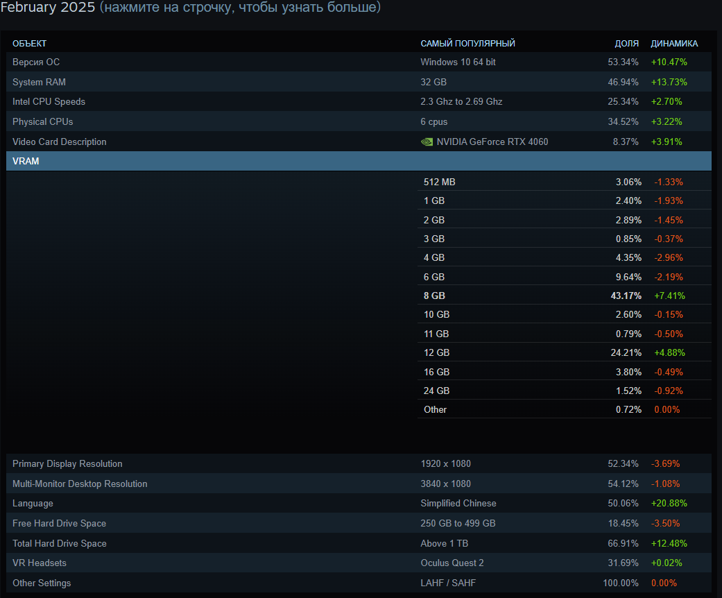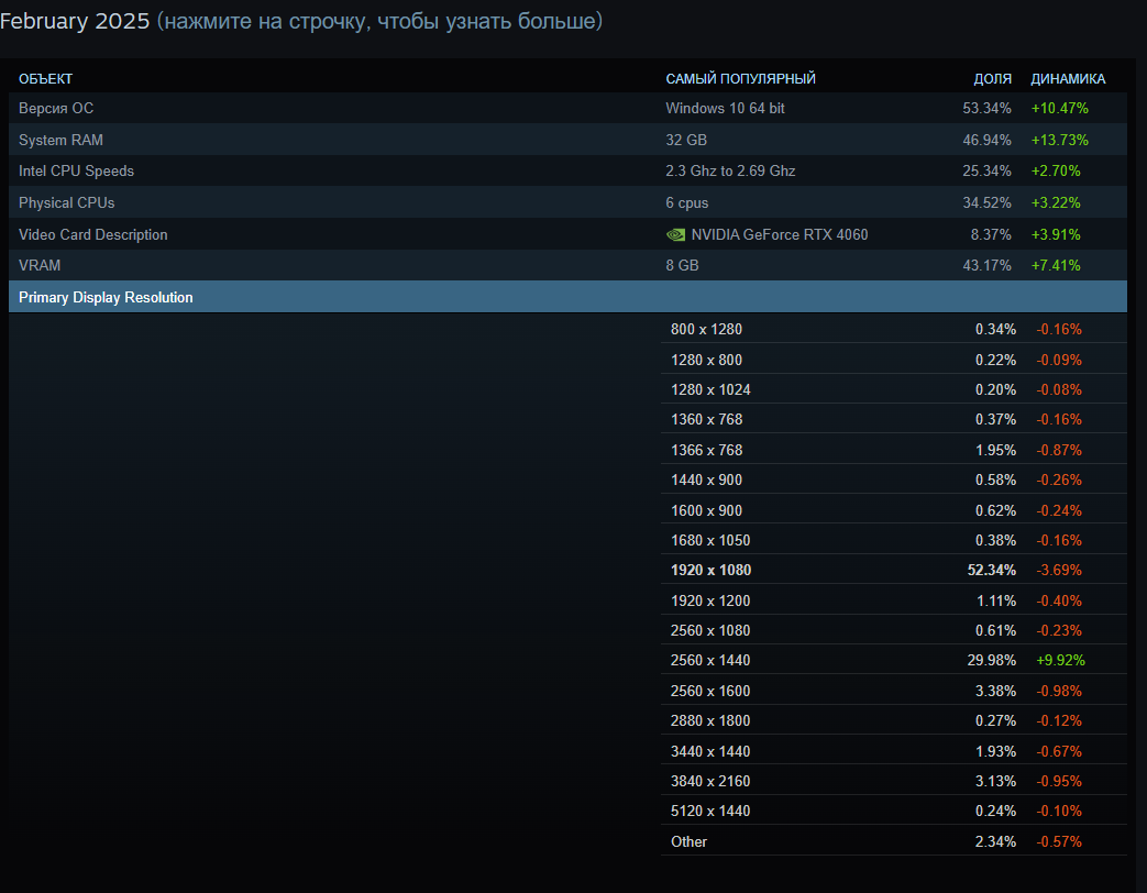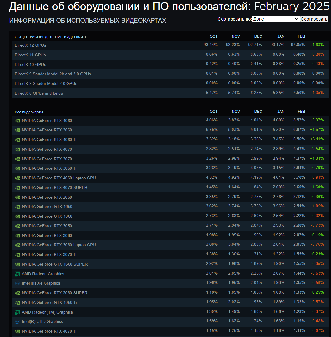 То, что вы тут себе нафантазировали о мощщщных чипах и бездонных объёмах VRAM - это лишь ваши хотелки, которые требуют существенных затрат. Статистика же неумолима - подавляющему большинству нужны бюджетные решения, на которых можно запустить любую игру на средних-ультра настройках Самая популярная карта с 16ГБ VRAM на руках (4080+4080s) - 1.73%, т.е. в 5 раз меньше Самая популярная карта кАМД тоже имеет 8 ГБ VRAM, и это вообще позапрошлое поколение - RX 6600 0.64%, т.е. её в 13 раз меньше на руках, чем 4060- что тут можно вообще говорить об АМД, а Ворворт?