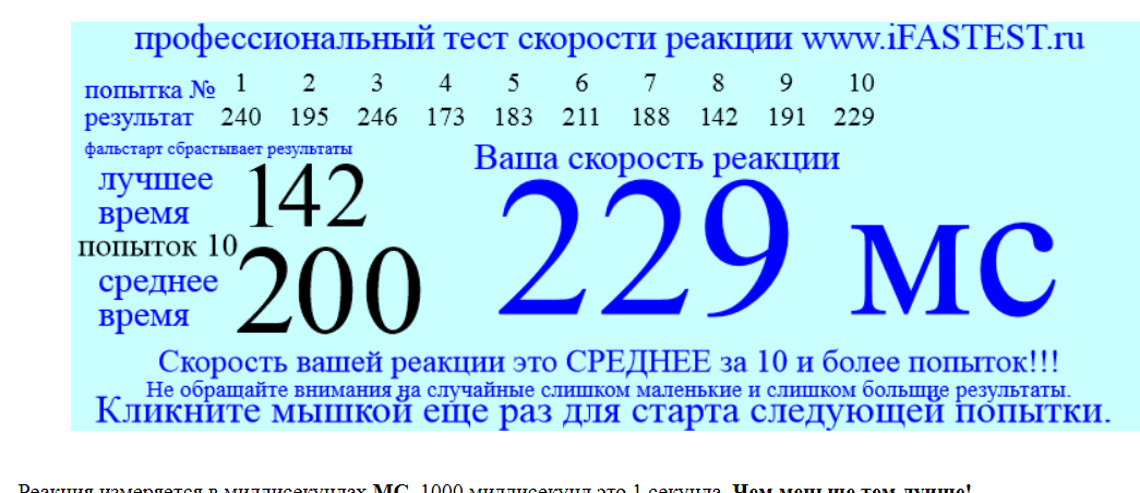 на самом деле давно полно всяких серьезных исследований, а не через сеть с пингом и на ТН мониторе. ФИЗИОЛОГИЧЕСКИЙ предел скорости реакции человека ~60мс. обычно округляют до 0,1 секунды. то есть, если бегун стартует с меньшей задержкой после выстрела - это считается фальстартом. систематически демонстрируемая осмысленная реакция у тренированных людей 150-200мс - это пилоты, крутые водители, профессиональные стрелки. геймеры где-то там же. это в режиме максимальной концентрации. обычная реакция расслабленного человека 0,5 - 2 секунды (!!!) - вспоминаем ПДД.