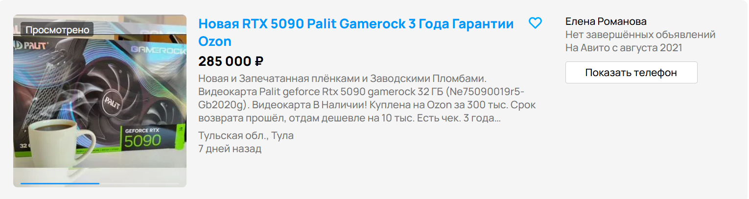 Процесс пошел, перекупы начали продавать 5090 Palit Gamerock, купленные на Озоне себе в убыток