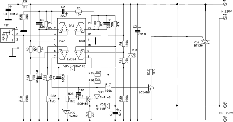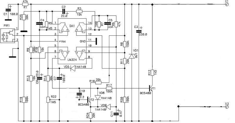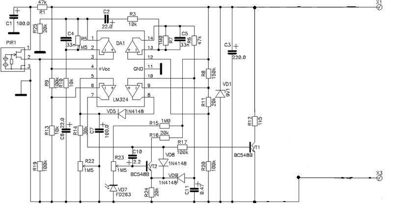 мне нужна схема обыкновенного пассивного инфракрасного датчика движения работающего от батареек (не сильно навороченная всякими прибамбасами типа выдачи тревоги при открытии корпуса и все такое).