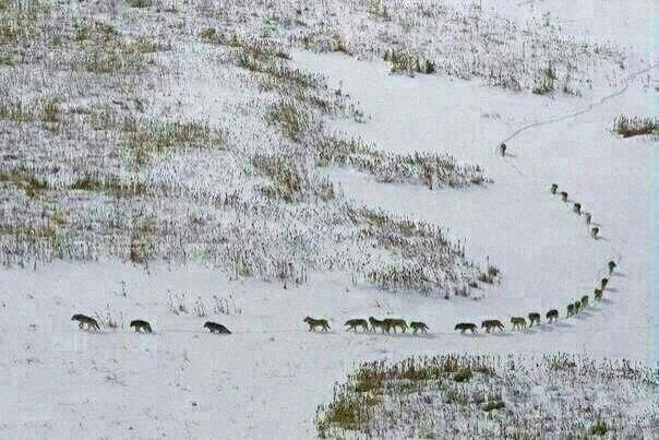 Инстинктивное сопоставление хищников - впереди идут трое самых слабых, низкоранговых и уже больных особи, однако с определенным жизненным опытом. По законам стаи, зимой, первые три волка должны протаптывать путь для остальных. За ними следует пятерка матерых, в большинстве случаев молодых волков - элита отряда, авангард (атакующие). Посередине в полной защите от нападения ступают 11 волчиц, включая беременных и альфа самку (стоит отметить, что у самок своя иерархия и подчиняются они только альфа самке). За ними еще одна пятерка матерых волков - арьергард (тыл). Позади, чуть в отдалении от всех, идет сам Вожак (как правило самый старый, крупный и опытный волк, повидавший многое и способный противостоять фактически любым неожиданным атакам). Доминирующему волку необходимо видеть всю семью целиком и контролировать ситуацию.