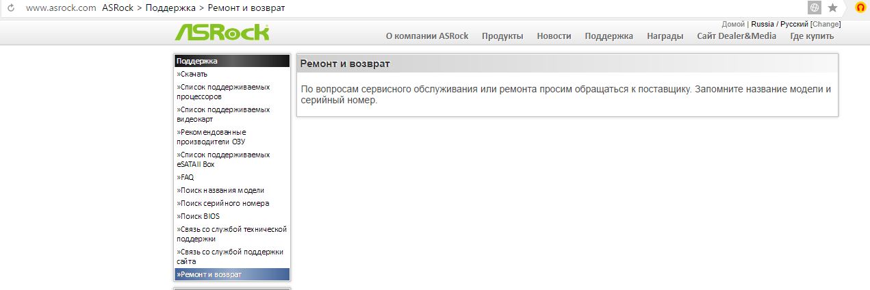 Живу в Москве. Материнка AsRock. Магазин Регард. С оф. сайта AsRock: "По вопросам сервисного обслуживания или ремонта просим обращаться к поставщику. Запомните название модели и серийный номер."