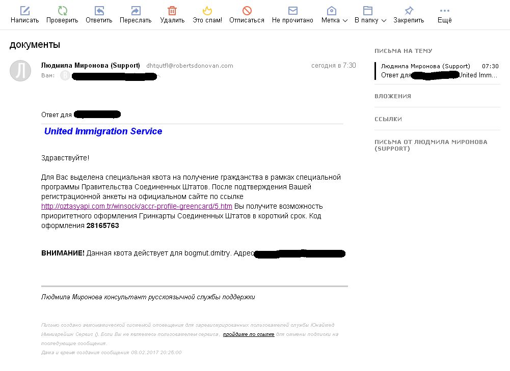 Всем привет. Пришло письмо (в спам) от какой-то конторы с предложением помощи по ускоренному оформлению грин-карты США. Типа мне "выделена специальная квота на получение гражданства". При переходе по ссылке в письме далее предлагается выбрать платный "пакет" на странице оплаты,где надо вводить реквизиты своей банковской карты. http://oztasyapi.com.tr/winsock/accr-pr ... card/5.htm