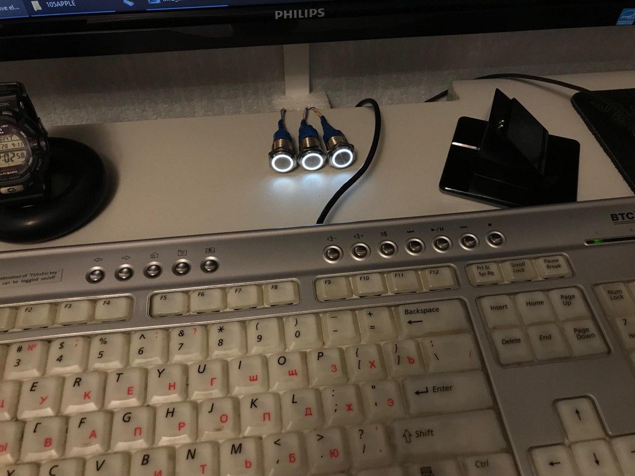 кнопка тока в субботу пришла с китая, еще не встроил в столешницу. и пока еще думаю где ее расположить, либо рядом с решеткой либо с остальными кнопками подсветки. в решетку помещается четыре 80мм вентилятора, но блиа дорага