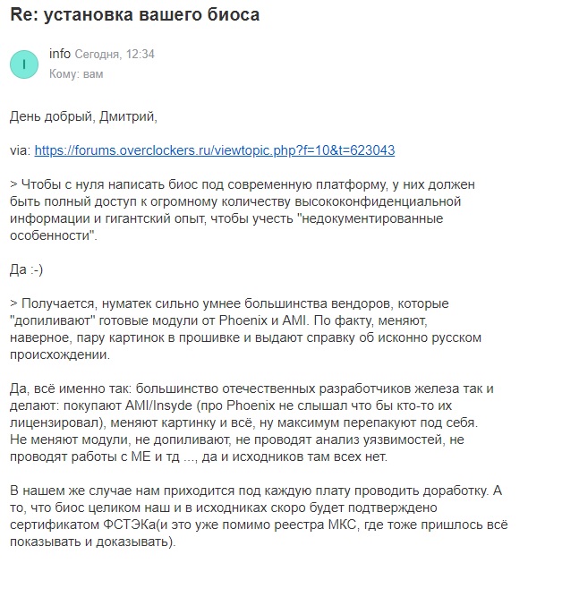 Это клоунада околотендерная, про "полноценную замену оригинального БИОС". Чтобы с нуля написать биос под современную платформу, у них должен быть полный доступ к огромному количеству высококонфиденциальной информации и гигантский опыт, чтобы учесть "недокументированные особенности". Получается, нуматек сильно умнее большинства вендоров, которые "допиливают" готовые модули от Phoenix и AMI. По факту, меняют, наверное, пару картинок в прошивке и выдают справку об исконно русском происхождении.