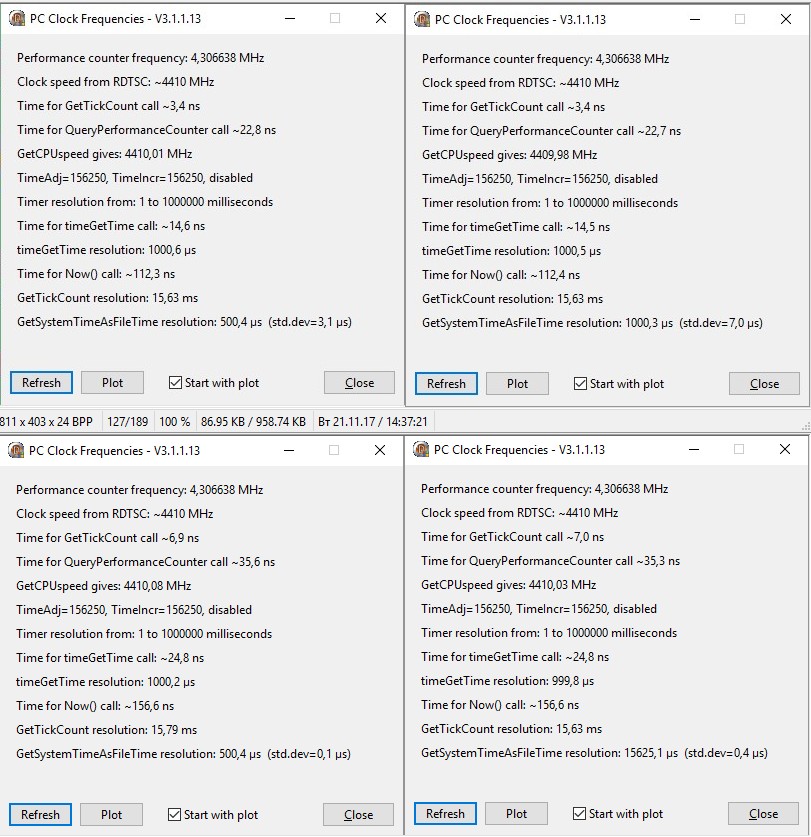 TSC + TSC without desync: bcdedit /deletevalue useplatformclock - bcdedit /deletevalue useplatformtick (make sure HPET is enabled in BIOS) TSC + RTC: bcdedit /deletevalue useplatformclock - bcdedit /set useplatformtick Yes HPET + RTC: bcdedit /set useplatformclock Yes - bcdedit /set useplatformtick Yes (make sure HPET is enabled in BIOS) PMT + RTC: bcdedit /set useplatformclock Yes - bcdedit /set useplatformtick Yes (make sure HPET is disabled in BIOS) Частота HPET 14.318180 MHz, в 4 раза выше частоты ACPI PM Timer. RTC устаревший тайминг с частотой от 2-х до 8192 Гц. Использует кварц 32.768 KHz HPET требует больше времени на вызов, чем TSC или PM Timer, но это важно только для системных прерываний. HPET и PM timer находятся в южном мосте. TSC в процессоре. Поэтому вполне допустима комбинация HPET (для времени QPC)+TSC (для тиков).