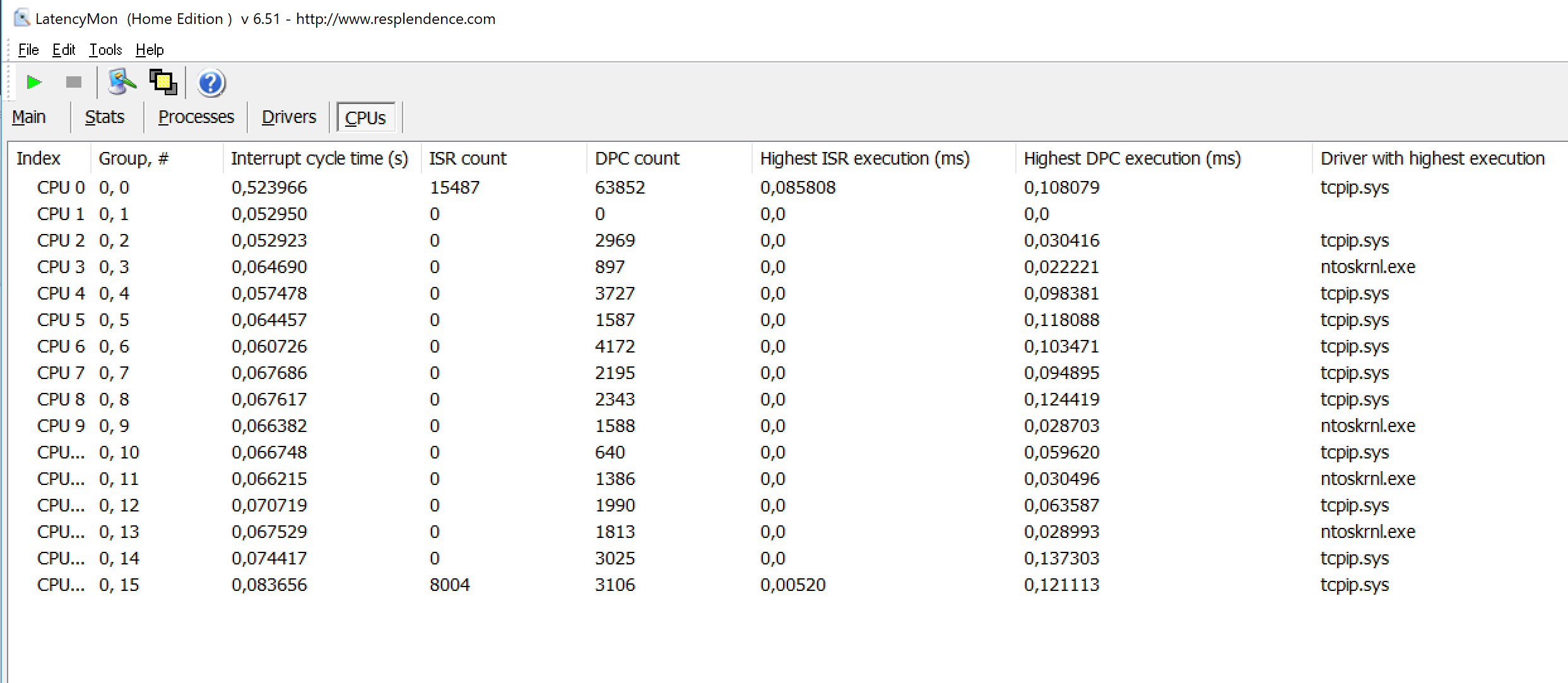 Замучался с HDaudbus.sys, постоянно лезет высокое ISR, перепробовал более десятка версий драйверов. Что в обычном, что в msi, для него нет разницы. Ни изменение битности и дисрктизации, ни сброс биоса и его даунгрейд ни откат на семёрку, ничего не помогает. Неужели единственный выход - внешняя аудио карта?