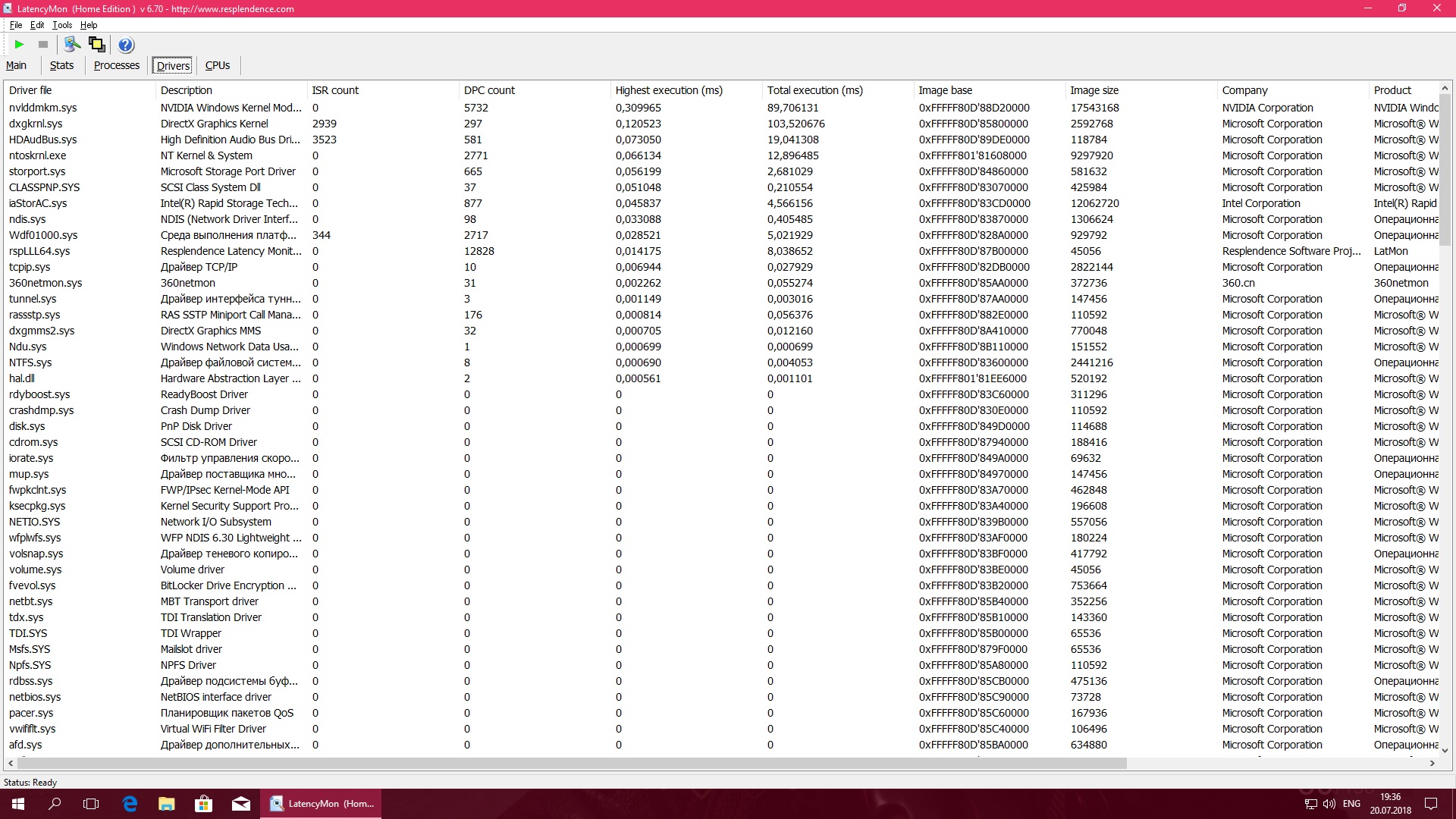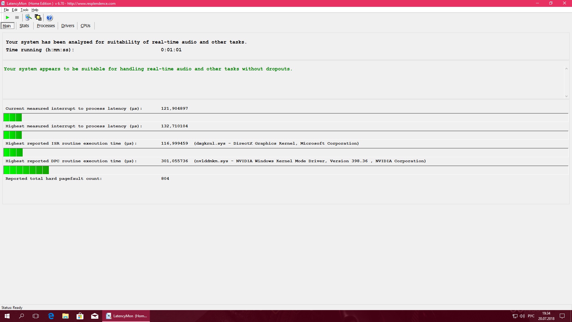 Здравствуйте! Сегодня создал отдельную тему на конференции по поводу странных рывком в играх: https://forums.overclockers.ru/viewtopic.php?f=22&t=595535 Система: GTX 1080, I7 8700, HYPER X PREDATOR 16GB 3200, SSD SAMSUNG 850 PRO Кроме проблем указанных по ссылке - в играх слышны кратковременные щелчки. Позже наткнулся на данную тему. Боюсь, нет ли у меня такой же проблемы по теме High DPC Latency on Pascal GPUs. Друзья, очень прошу, гляньте, пожалуйтста, мои результаты Latency Mon. Я проделал по рекомендациям следующие действия: В панели управления Nvidia выставлен - Предпочтителен режим максимальной производительности Проверил целостность хранилища с помощью команды sfc/scannow - нарушений целостности не обнаружено Произвел тестирование Latency Mon. Большое спасибо за ответы!