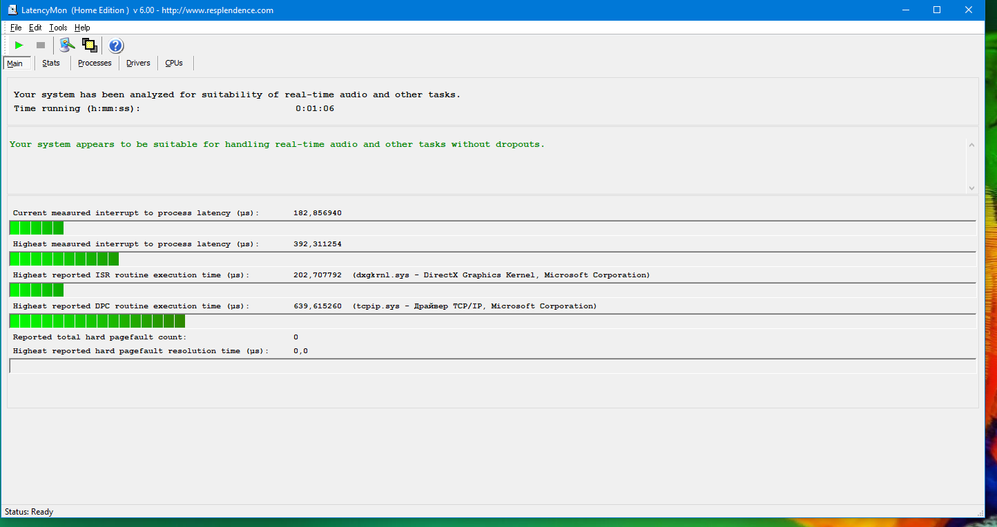 Ну что, начинаю. микрофризы, треск в наушниках это если в кратце, а так DPC latency на максимум уже много чего пробовал, проблема иногда исчезала, иногда возвращалась чаще всего возвращалась и последние 6 месяцев я борюсь с ней аида и мемок тесты отличные была система на хдд и ссд поменял материнку на круче тестил без видяхи на встроеной интеловской и все было ОТЛИЧНО!, даже супер отлично сейчас уже думаю перепрошивать биос видяхи с oc версии до fe;