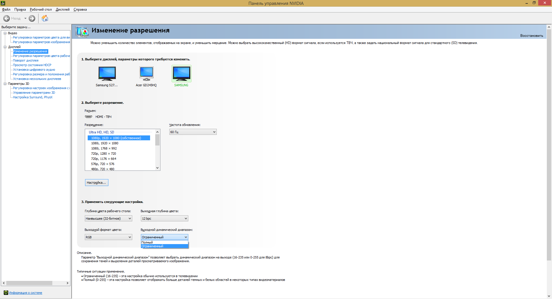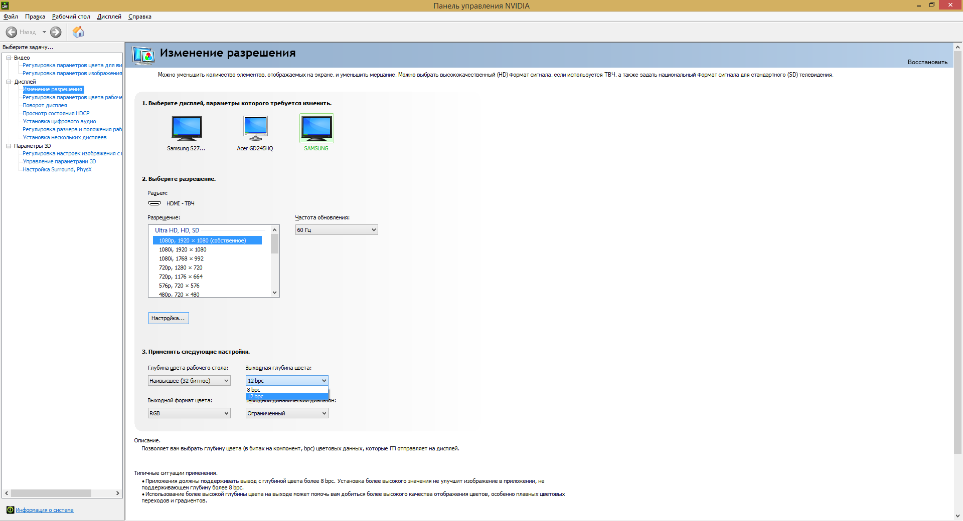 ТВ Samsung UE48H8000AT Есть ли смысл выставить 12 bpc? Также интересует, что лучше поставить: полный или ограниченный выходной динамический диапазон? При полном много деталей изображения просто пропадают за черным цветом как при большом контрасте.