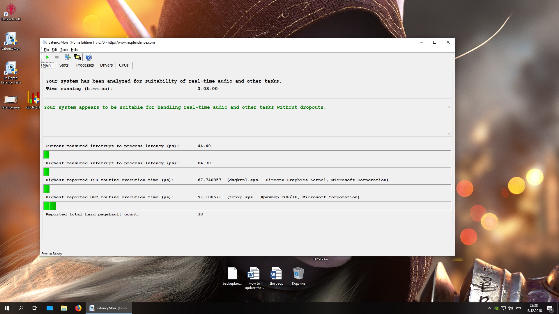 Добрый день. Прогнал сейчас LatencyMon как в ФАКе написано (2 минуты ждать после загрузки). Результат Файл подкачки включён, ещё оперативка разогнана и в прям 100% стабильности не уверен (тестмем5, игры, таймспай экстрим пока никаких ошибок не выявили). Это я про pagefault 38. Вроде это с памятью связано. В остальном норм результат? Но вот DPC Checker показывает задержку 1000, т.е. желтизна сплошная. Стоит вин10 1809, на 1803 было так же. Даже помню со старой вк (печ780) в основном 1000 было, иногда 500. Я так понял, это дохрена. Но вроде и с вин10 этот чекер может не корректно работать? В общем, что делать?)