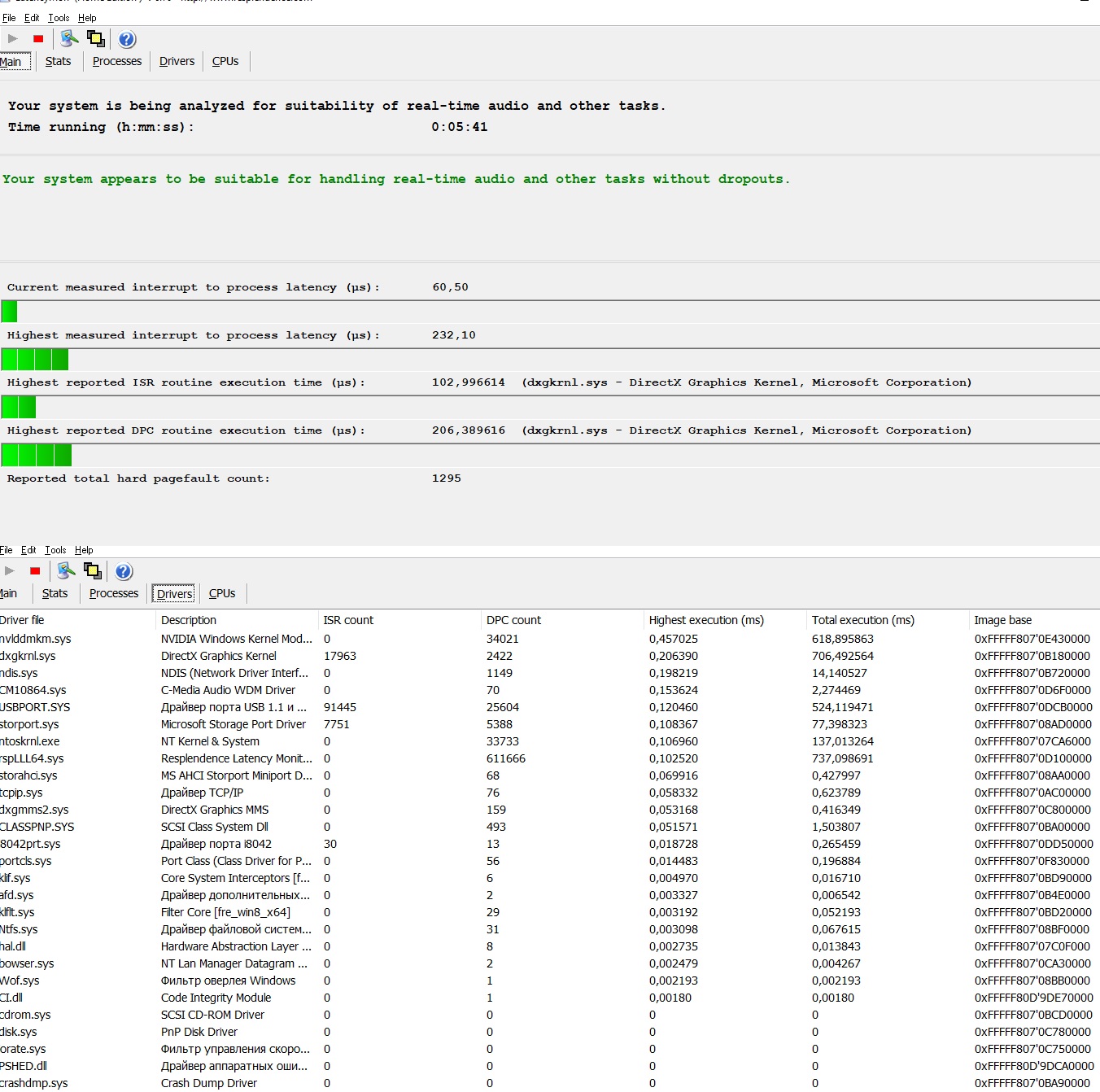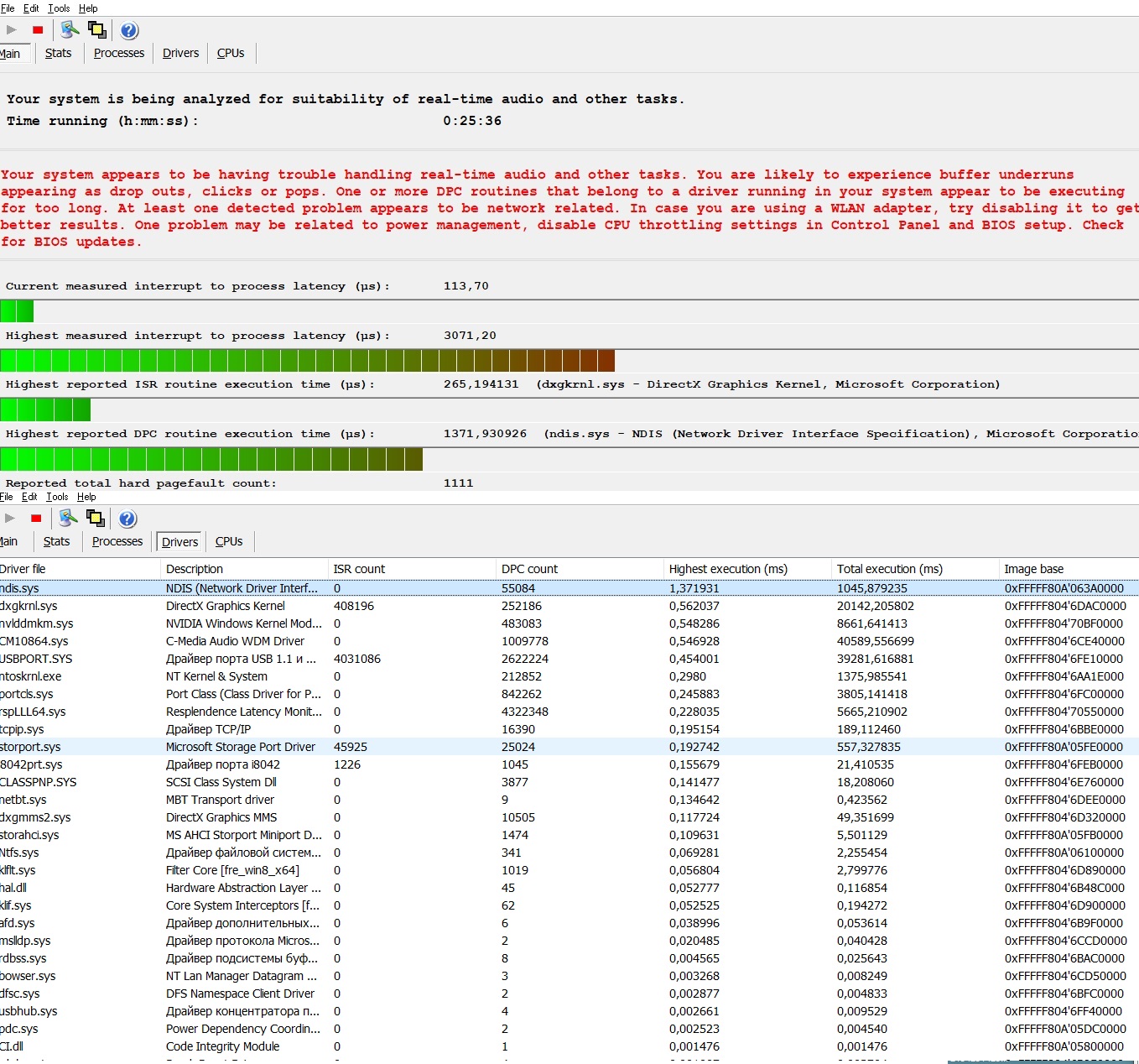 Добавлено спустя 16 минут 28 секунд: Вот результат после перезагрузки.Лаги со звуком и мышью не пропали.После запуска хрома процесс NDIS взлетел в цифрах до 6 и графики стали красными