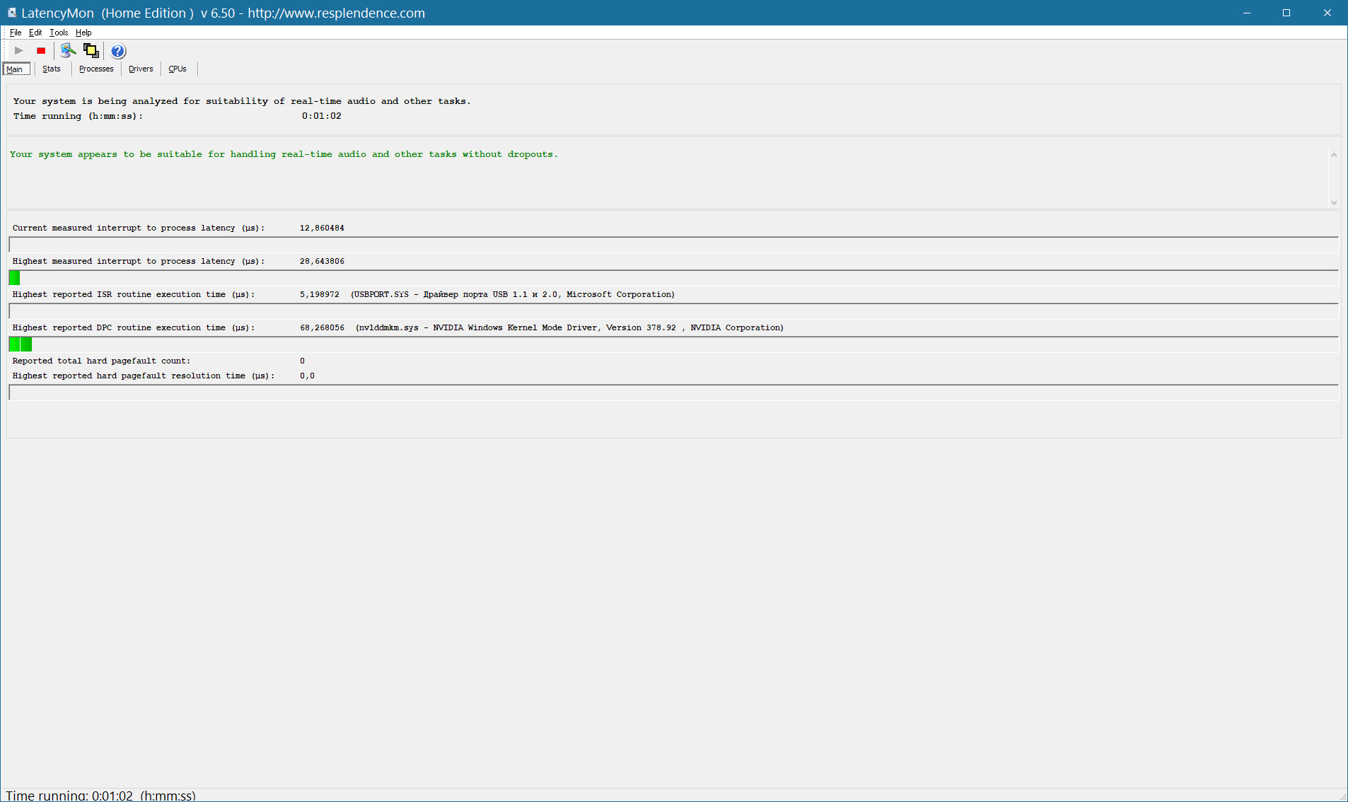 Осуществлять мониторинг программойLatency Monitorнужно в течение 1 минуты, в состоянии простоя системы т.е. без дисковой, сетевой активности, и любой другой, с выключенным ав и приложениями в трее и автозагрузке, не раньше чем через 2 минуты после загрузки системы. Не двигаем мышку и не используем клавиатуру в момент измерений. Потом остановка и скриншот.