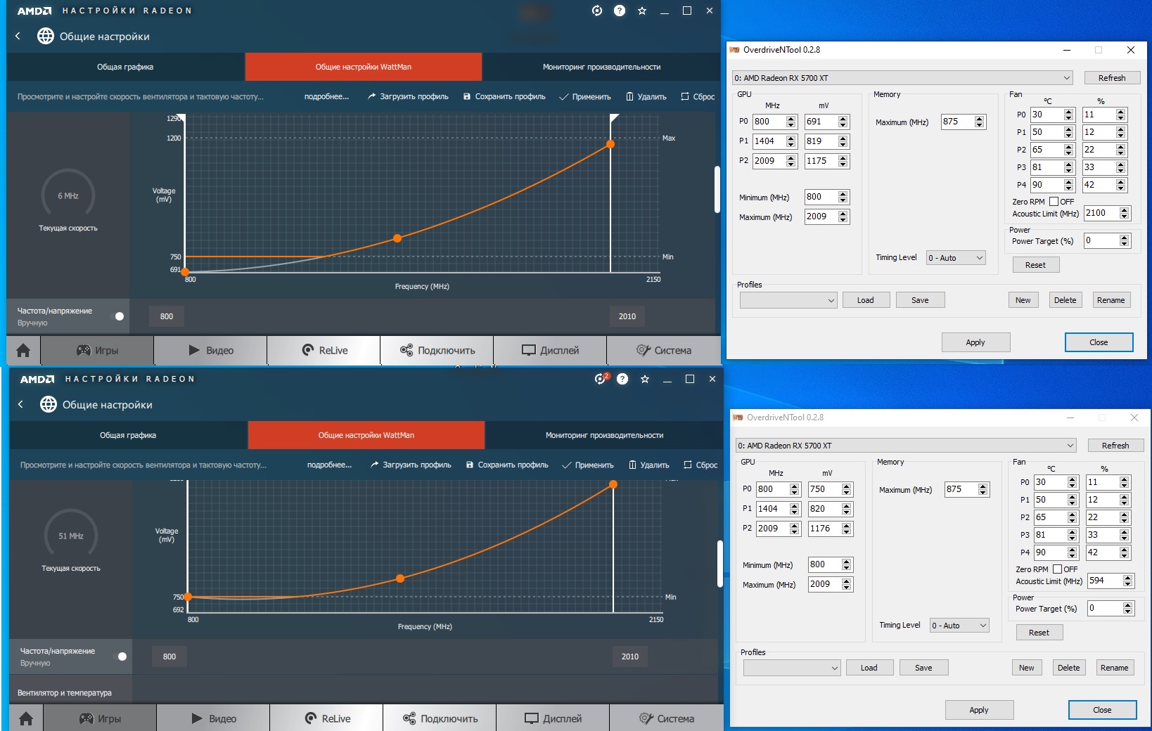 Для своей карты можешь оставить 750мВ для 800мгц как минимальный вольтаж и попробовать 1075-1100мВ для 2000мгц в кач-ве максимального. Ну и промежуточный выставить около 900мВ для 1400мгц. Похоже на 5к серии что-то поменяли, потому что на полярисах 8 стейтов, а не 3.
