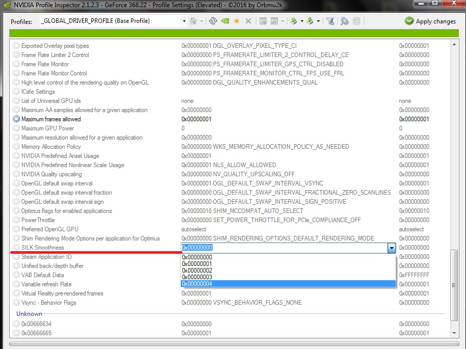 Потыкал и не понял. Разницы не вижу между максимумом и отключено. Наверное надо знать где искать. А может оно вообще для SLI или на картах до паскаля не работет, пока или всегда, или в драйвере пока эта фича не допилена или еще что... Хм, а вот в самом низу инспектора есть неизвестный параметр 0х00666634 и у него в опциях есть включение 0х0001 (silk test app).... Silk smoothness работает! При настройке 0х0004 (по идее максимум) в главном меню фолыча4 все меню в лютом мыле просто вхламище. Осталось понять зачем это нужно