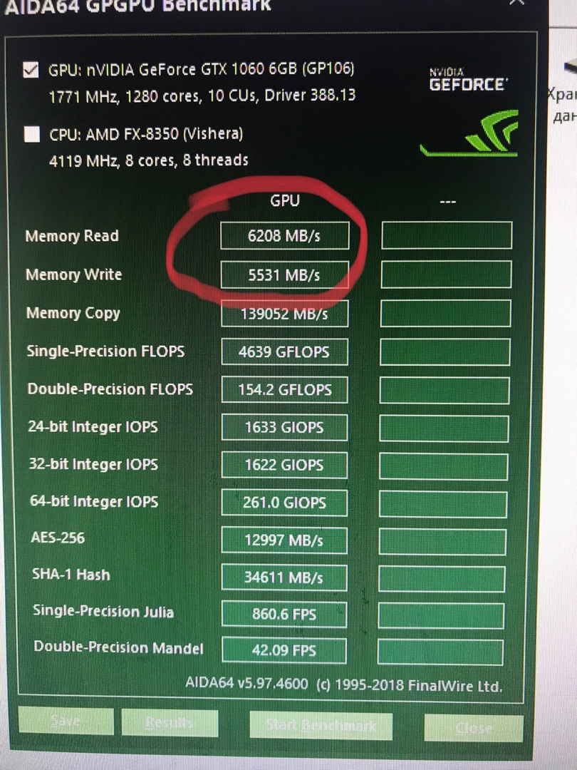 Всем привет!может кто-то наставит на мысль что может быть... имею Gigabyte GeForce GTX 1060 WINDFORCE OC 6 гб.карте 3 горда.только игры.неделю назад заметил фпс в играх упал на 40-50 процентов.переустанавливал драйверы менял комп.биос обновил.все безуспешно.ничего не свистит не гудит.выше 80гр не нагревалась.слежу за тепрературой кроме падения фпс никаких недочетов больше нет.то что раньше шло на ультрах теперь илет на средне низких. сделал текст в аиде и увидел вот что. первые две строчки сверху Memory Read 6208mb/s и Memory Write 5531mb/s Memory Copy 139052mb/s в общем падение скорости чтения и записи памяти в 2 раза.что копать?заранее спасибо(напишите в лс если не сложно(карта естественно не на гарантии)