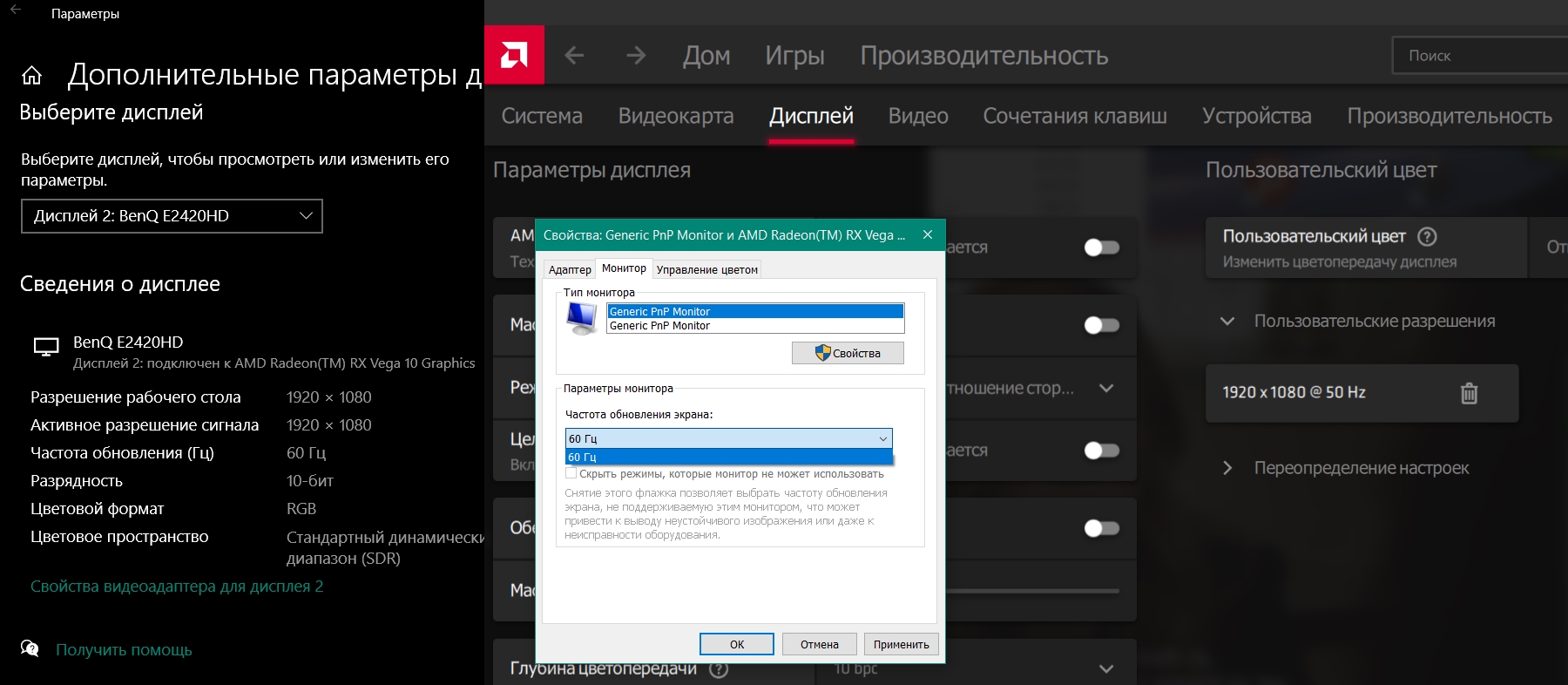 А как задать кастомную герцовку для второго монитора? Я настроил в приложении АМД профиль, например, с 50Гц. Он сохранён, виден. Но как теперь его применить? Выпадашки на 50Гц так и не появилось в винде, галка на кастомные профили в окне винды не активна. Доступно только 60Гц. Для основного монитора ноутбука (2700U) вообще отсутствует возможность создать такой кастомный профиль.