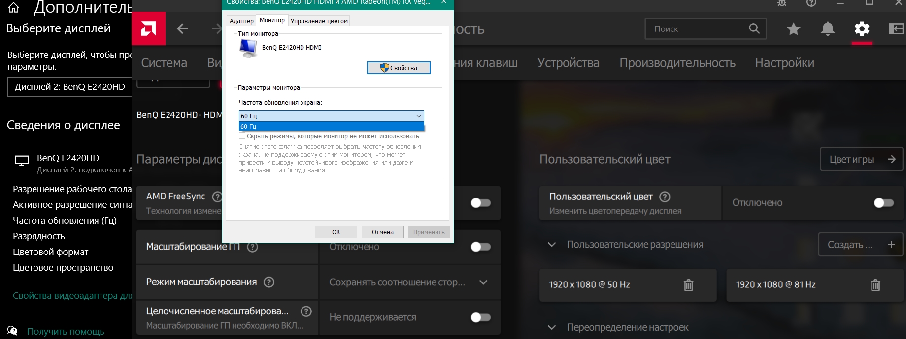 на стандартных драйверах винды не создаются герцовки. Вместо generic должно быть твой бенк. В диспетчере устройств как твой моник отображается? поставь для него дрова. https://www.benq.com/ru-ru/support/down ... river.html