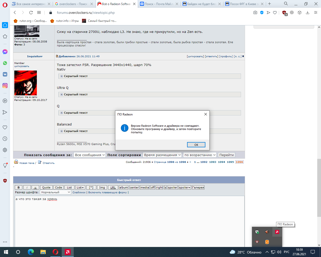 1. Старайтесь соблюдать Правила Конференции! Они писаны для всех, в том числе и для этой темы. 2. Прежде чем написать свой вопрос, обязательно ознакомьтесь с разделами Часто задаваемые вопросы, Справочный центр Radeon Software и База знаний (особенно это касается новичков). Ведь может быть ответ на ваш вопрос уже там! 3. Аналогично предыдущему пункту: не ленитесь читать посты других пользователей! В них вы тоже можете найти решение вашей проблемы. И очень убедительная просьба: не нужно всем по сто раз писать об одной и той же найденной проблеме! Это только захламляет тему. Будет лучше, если к комментарию о найденной ошибке вы прикрепите доказательство о том, что вы уже отослали баг-репорт на эту ошибку! Такие комментарии будут смотреться гораздо приятнее, да и в целом ваши действия могут оказаться ценными для всего сообщества! 4. Не нужно обсуждать действия куратора и торопить его! Все претензии и предложения по изменению шапки можно написать куратору в "Личные сообщения". И всегда старайтесь быть вежливым. Помните: как вы относитесь к людям, так и они будут относиться к вам. 5. Фанбойство между лагерями-конкурентами будет жёстко пресекаться! В теме не запрещено упоминать конкурентов, их успехи или неудачи, но ни в коем случае не делать это агрессивно и не провоцировать остальных на выяснения отношений! 6. В теме не допускается флуд. Не нужно захламлять тему, поэтому всегда старайтесь писать по теме, иначе весь флуд и оффтоп будет стираться без предупреждения! 7. Запрещено разводить холивары на такие темы, как "сравнение операционных систем", "майнинг", "телеметрия", "удаление драйверов с помощью сторонних утилит"! Для этих тем в Конференции существуют специальные разделы! Такие холивары будут безжалостно удаляться, а зачинщики и участники получат предупреждения! 8. Не используйте красный цвет в сообщениях — оставьте его для модераторов и куратора! Не злоупотребляйте и остальными цветами! 9. Не рекомендуется использовать односложные сообщения (к примеру, "аналогично", "+1"), дублировать сообщения с просьбой через одно сообщение от Вашего предыдущего (тем более, на одной страничке и посланных в один день) и задавать вопросы, типа "когда выйдут новые драйвера?". Старайтесь не засорять тему! 10. Запрещено обсуждать и выкладывать информацию/слухи без ссылок на источник, а также выкладывать результаты "тестов производительности"! Непроверенный материал будет удаляться во избежание флуда и дезинформации участников форума. 11. Когда задаёте вопрос, старайтесь описать проблему как можно яснее. И обязательно прикрепляйте информацию о вашем компьютере, если её нет в "Профиле" или в "Подписи".