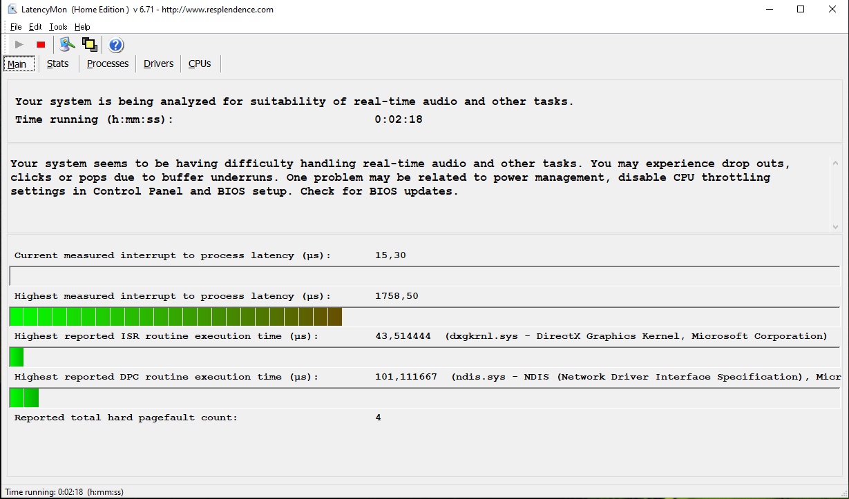 NOTE: some processes were hit by hard pagefaults. If these were programs producing audio, they are likely to interrupt the audio stream resulting in dropouts, clicks and pops. Check the Processes tab to see which programs were hit.