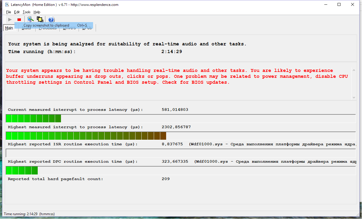 Highest reported total ISR routine time (%): 0,000001 Driver with highest ISR total time: Wdf01000.sys - Среда выполнения платформы драйвера режима ядра, Microsoft Corporation