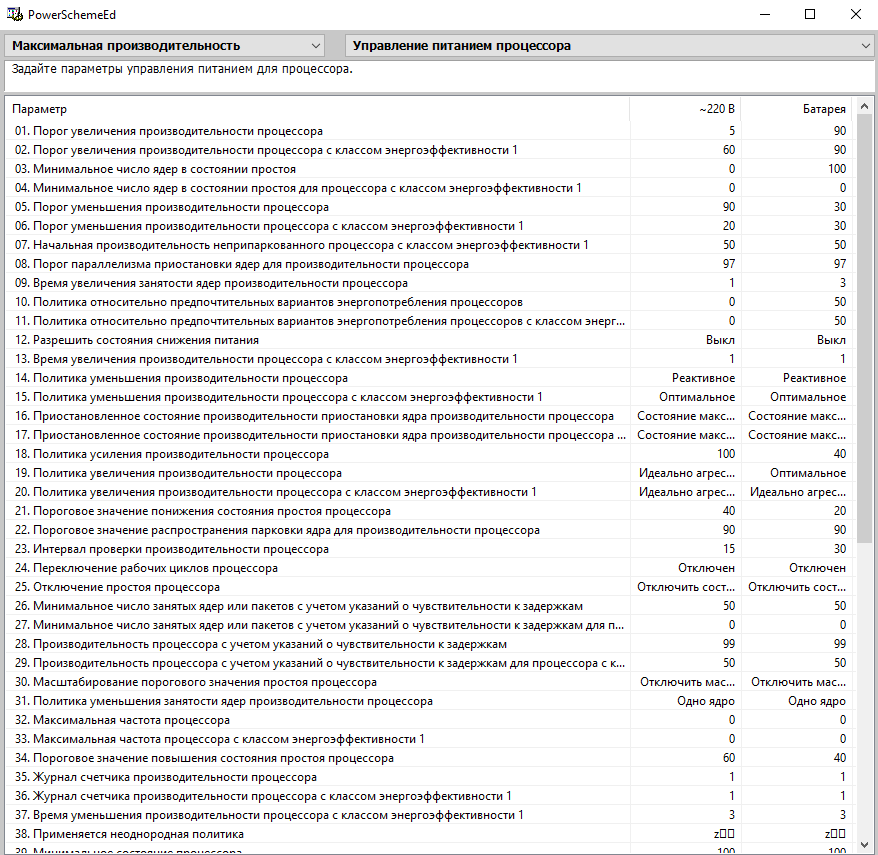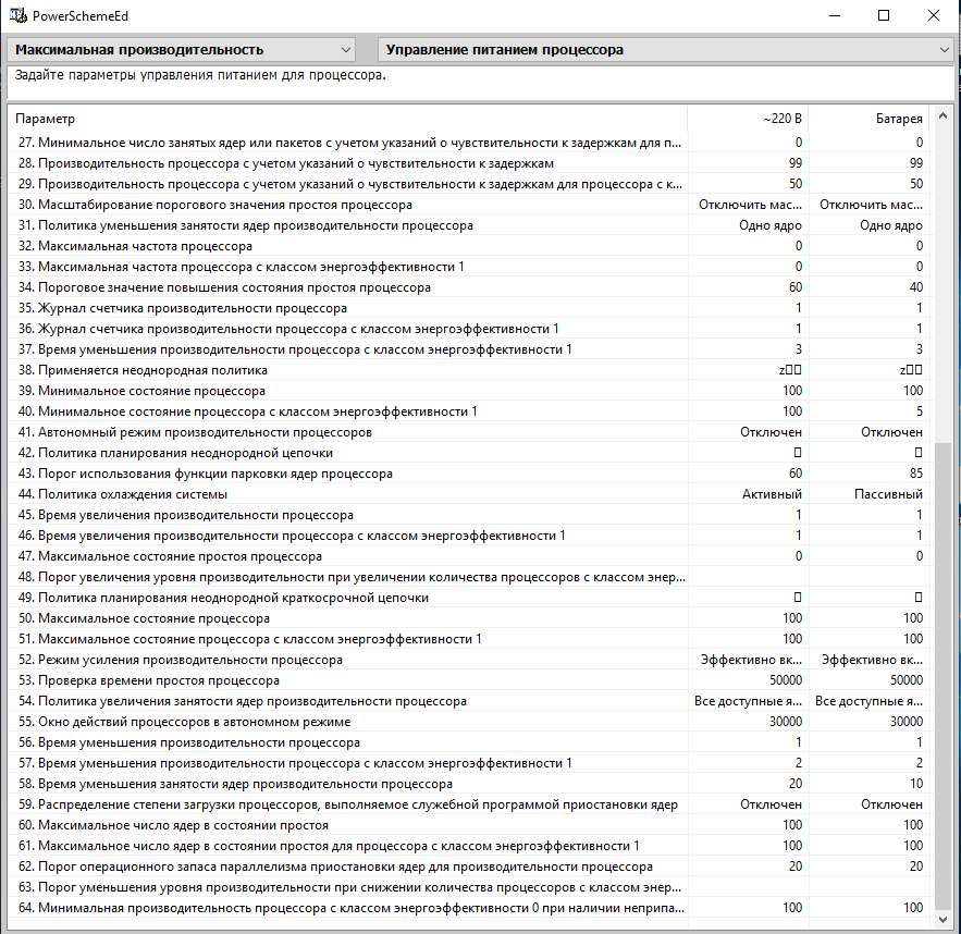 St@s1987 С другим диском нет возможности проверить, диск один, винда нормально загружается, все программы нормально работают. Поковырял прогой схему электропитания, во время простого передвижения стало меньше фризить при таких настройках, как на скрине, но в диспетчере теперь любой процесс как будто на 100% грузит процессор, при этом всё окей, никаких фризов в самой системе нет. Если сбросить настройки схемы электропитания фризы возвращаются, ну и в диспетчере всё становится окей.