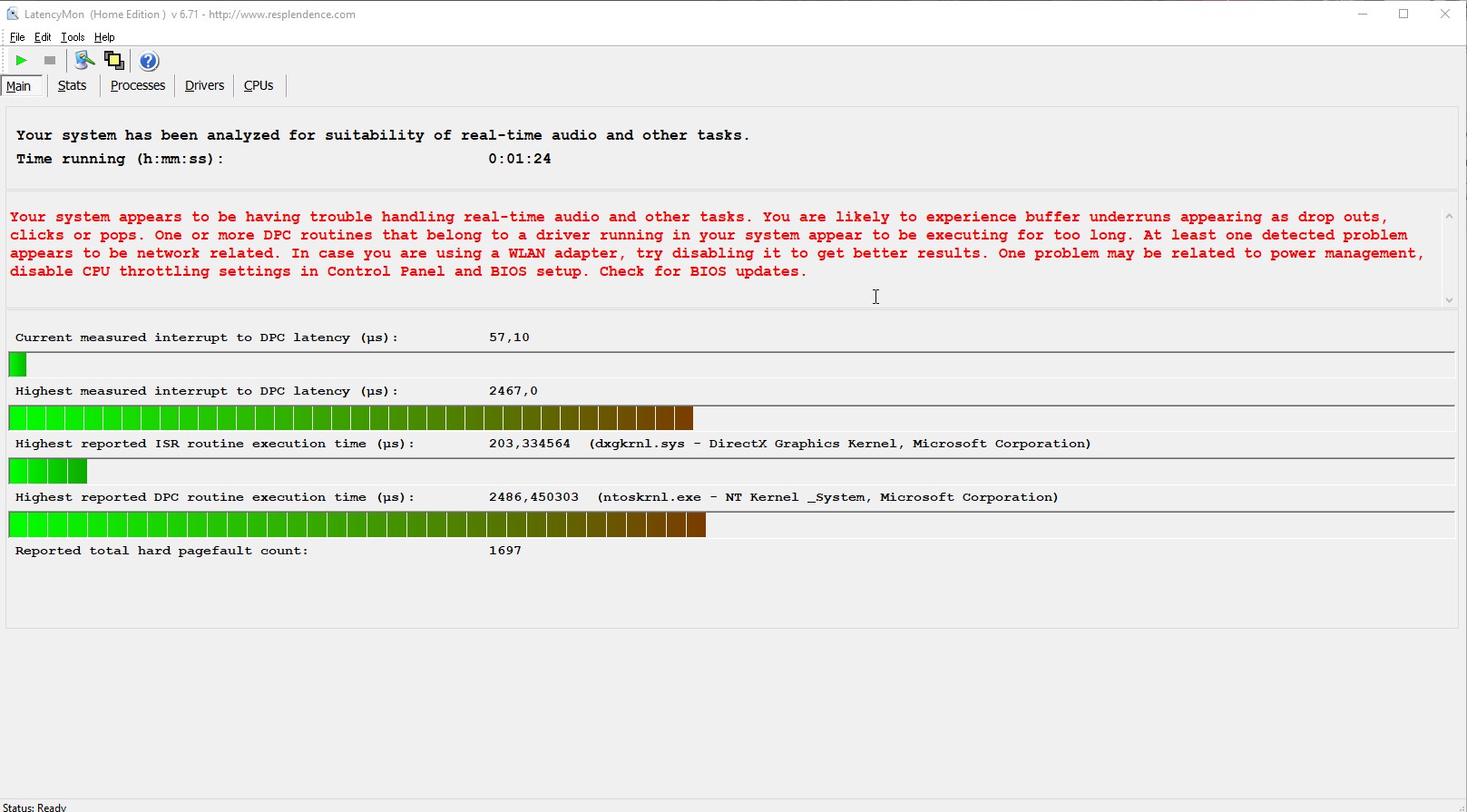 Попробуйте поставить режим макс. производительности видеодрайверу и после перезагрузки перемерить. Обратите внимание на вкладки Процессы и драйверы- и счётчик обращения к виртуальным страницам 300+ (Hard Page)- в момент замера какое-то приложение проявляло активность- гляньте что это, и устраните- перемерьте. Обычно это Защитник виндовс.
