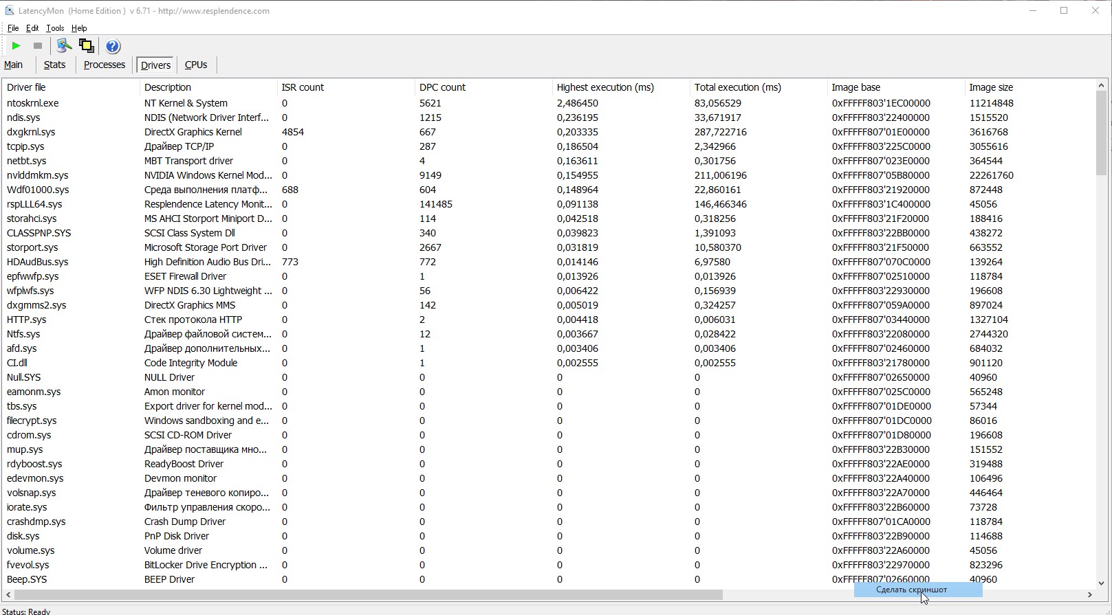 Осуществлять мониторинг программойLatency Monitorнужно в течение 1 минуты, в состоянии простоя системы т.е. без дисковой, сетевой активности, и любой другой, с выключенным ав и приложениями в трее и автозагрузке, не раньше чем через 2 минуты после загрузки системы. Не двигаем мышку и не используем клавиатуру в момент измерений. Потом остановка и скриншот.