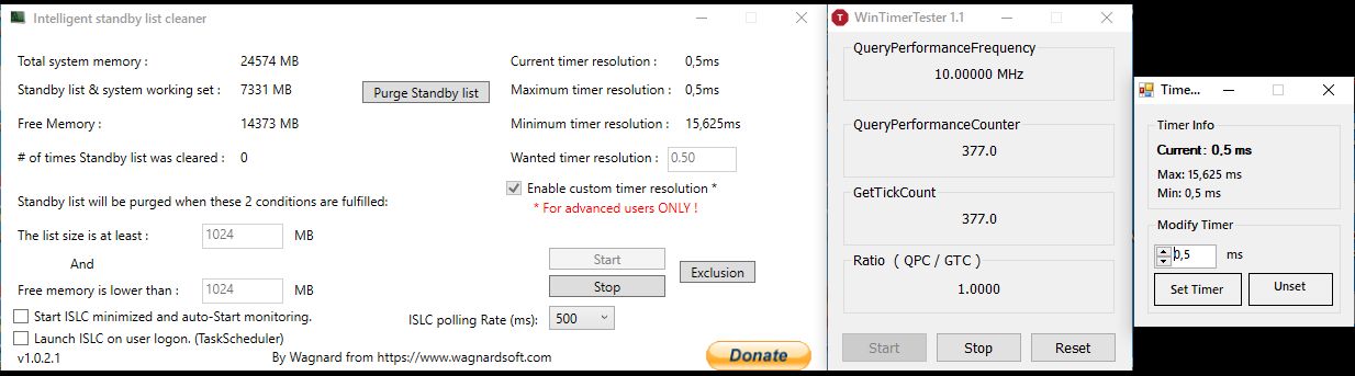 Позднее дополню каждый раздел. Все проблемы у нас связаны с тем, что windows относится к операционным системам с вытесняющей многозадачностью. Вытесняющая многозадачность требует обработки системного прерывания от аппаратного таймера. По истечении кванта времени, отведённого процессу, происходит прерывание и вызывается планировщик процессов. Частота вызова планировщика критична: слишком частый его вызов будет расходовать процессорное время впустую. Единственное, что мы можем изменить - это увеличить время кванта и поменять соотношение квантов времени на активную задачу и задачи в фоне, за это отвечает параметр в реестре Win32PrioritySeparation По умолчанию 0х26 кванты 18:6 = Оптимальный вариант. https://github.com/keoy7am/Win32PrioritySeparationTool При этом само время кванта зависит от системного таймера. При системном таймера 15.625 мс оно будет больше, чем при 1.0 мс. Высчитывается время системного таймера * тики. 1 тик= 3 кванта Для системного таймера 0.5 мс фону тогда буде даваться 0.5мс*6/3 = 1мс из каждых 4 мс. При 1 мс - 2мс из каждых 8мс. При 2 мс - 4мс из каждых 16мс. Для борьбы с фризами оптимально выставить системный таймер 0.5мс.