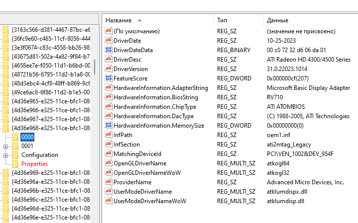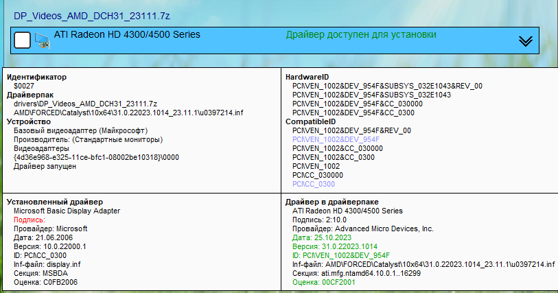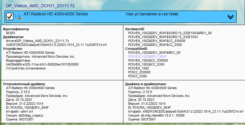 Здравствуйте. Есть Радик НД4350. Есть 11 винда. Всё бы ничего, но после очередного обновления винды - перестали дрова устанавливаться из драйверпака. Они вроде как и установились, но не установились. В диспетчере устройств висит как "ATI Radeon HD 4300/4500 Series". В видеокартах, всё как положено. Но дальше было пусто - драйвер не установлен - Тип адаптера: microsoft basic display driver. А в другом месте написано, что дрова от Asus и установлен драйвер ATKDispLowFilter.sys. Доступны стандартные разрешения: 800х640, 1280х1024 и т.д. вплоть до 1920х1440. А вот разрешения 1366х768 нет. Дрова на монитор стоят. Разрешений формата 16:9 нет в списке. Дрова уже всякие пробовал. Всяко разно крутил.