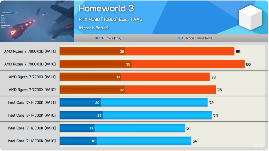 у меня 3д цпу нет, ничего не могу сказать, но по тестам в cp2077, что я выкладывал, картинки, на 10/11 и 5950x - был одинаковый фпс средний 89/90 в 2к и 127/128 в FHD -сходимость результатов была всегда вплоть до 1-2фпс.