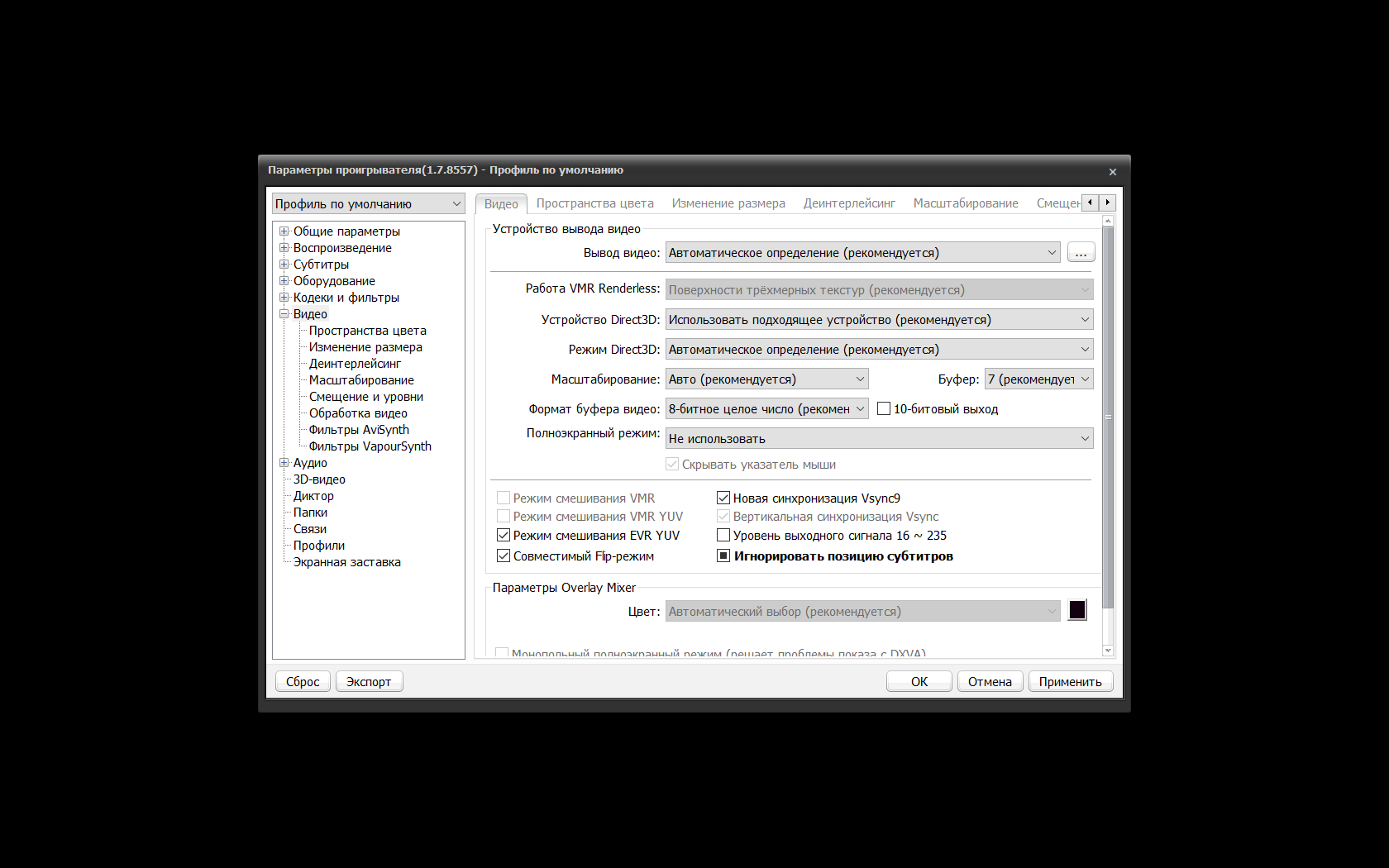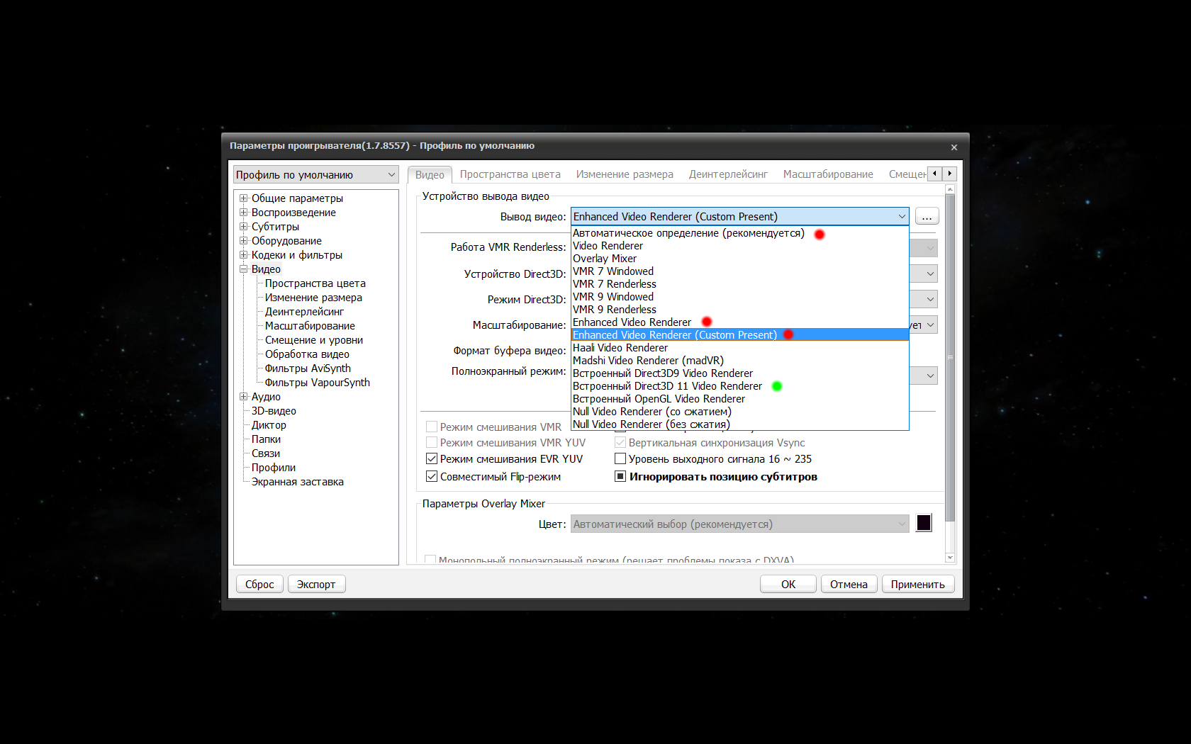 Gordon_Shamway не могу у себя найти эту опцию. Даже раздел такой не представляю где он спрятался?! видимо у меня другая версия плеера. У меня эти разделы отделены друг от друга Аудио и Видео и преимущественно где не понятно что да как у меня стоит АВТО. ...и, возможно, не в драйверах дело!