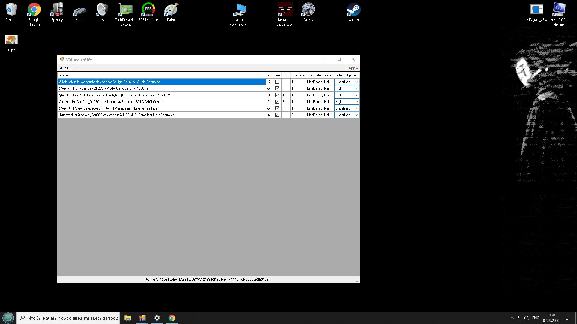 Добавлено спустя 2 минуты 53 секунды: 1.Что я хочу сказать сразу , нвидиа кернел не блочится если у вас нвидиа , нвидиа кернел растет сильнее если у вас виндоус не 1609 или 7 2.Директ кернел и хороший латенс можно удерживать с помощью программа msi если надо покажу скрин что и как 3.Irq процессы в msinfo не должны ложиться друг на друга , каждый процесс на своём месте , то есть ноль конфликтов . 4.Биос должен быть настроен так . Turbo + xmp , видеокарты можно поставить на второй gen как и dmi процессора на второй ген , девайсы должны работать только в заднем порту желательно мышь и клаву в usb 2.0 , звуковая карта hd audio realtek офнута,свой звук на внешке usb, в биосе выключены c- приоритеты и c config , видеокарта установлена на 256 вроде так называется шина , там 32 64 и тп,отключен режим старый девайсов это типо те которые как старые мыши шариковые порты. на этом всё в биосе 5.Далее винда hpet off естественно. Удален весь мусор что предлагает мне винда 2004 оригинал ,отключено очень много служб. установлены все в комплекте фишки от нвидиа кроме экспиринс , но отключены через дистпетчер, опять же выключен через биос hd аудио контроллер ,пользуюсь usb звуковой картой,в автозагрузка ничего нету,убран из диспетчера процесс не помню названия SearchUI.exe вроде, в автозагрузках лежит util msi 2,драйвера дефолтные на всё что установились кроме видюхи , стоит последний драйвер 452.06 , пользуюсь новой услугой для 2004 виндовсов - планирование графического процессора с аппаратным ускорением ( не знаю что это дает). на это с виндой вроде всё.