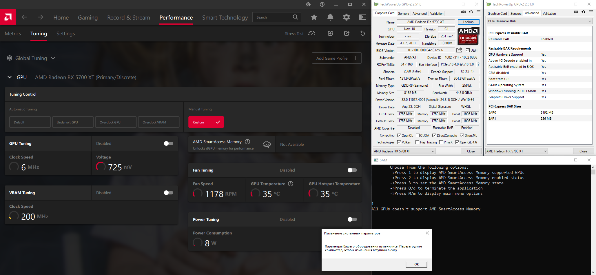 PS: Да, и вот тебе еще по поводу, реальный это баг с SAM, или просто драйвер неправильно статус показывает. Первый скрин сразу после "бажной" загрузки, т.е. драйвер сообщает, что SAM не поддерживается. Второй - после рестарта GPU: