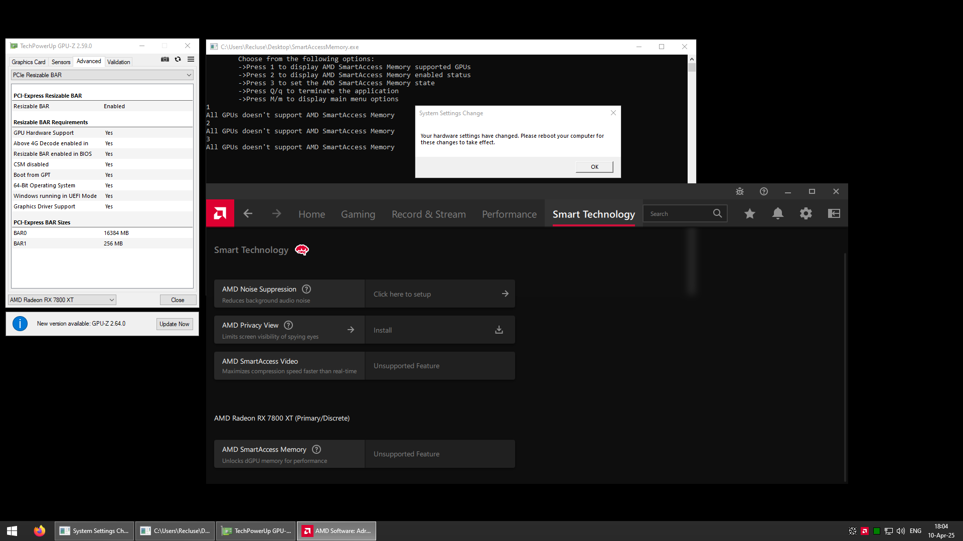 Спасибо, попробую. Только сегодня утром подумал, когда очередной раз после нормальной работы вчера и 5-6 перезагрузок по ходу, утром после колд бута снова увидел окно "конфигурация была изменена..": я при установке ОС на другой диск, тупо перекинул содержимое из AppData\Local\AMD из под другой винды - хотел настройки и игровые профили сохранить таким образом. Надо было с этого начинать - буду дома, попробую начисто драйвер через последний DDU переустановить. Кстати, гпу-з после загрузки с этим уведомлением, отображает rebar как активный, везде enabled и yes прописано + памяти 256 и 16Гб. Однако в адреналине он серый и unsupported feature. Вечером почитаю тред после приведенных сообщений, спасибо.