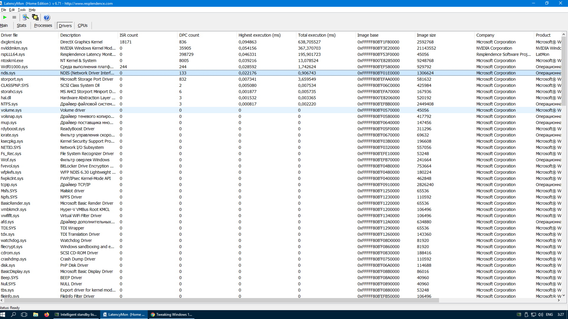 Все тут говорят о latency mon и не говорят о том зачем создавалась эта тема Вся эта задержка вызывается только nvidia и вызываться она может не подходящим драйвером под определенную сборку виндоус и вообще есть некоторые драйвера которые решают проблему интернета например tcpipsys и ndis sys , решают проблему жесткого storport может в амд например - амд ата в диспетчере Но всё опять же это лишь цифры , я кину и свои скрины где я не использую не хпет , не msi utility , не настройку биоса ,а именно они так сказать влияют на эти ничто не дающие в игре цифры. Все хотят использовать свою мышь как предмет легкости и быстроты наводки,хотят передвигать ей так что казалось мышь выполняет полное повторение руки и по оси и игрику и вниз и вверх Но получается так что задержку вызовут сами же настройки , вы захотите побороться с латенси моном , сделать лучший маустестер , но всё что вы увидите это цифры которые вы не увидите в игре ,а вот когда ваши руки коснуться онлайн игры тут то вы и поймете всю прелесть. Хочу вам рассказать один секрет и чтобы вы не ходили в другие дома , в другие города и не занимались шизотипическими делами В общем если хотите видеокарту от 16.. серии то нужен блок не 550 в не 650 в ,а 1000 ват самый лучший который может быть купленный не в днс. Второе если вы являетесь обладателем карты амд это не значит что вы победили Третье у кого i9 10000 вытащите видеокарту,подсоедините hdmi к встроенной графике,установите windows 1607 ltsb , поставьте драйвер на чипсет и больше ничего не делайте. Скачайте вашу игру , поставьте минимальные настройки графики в вашей игре и минимальное разрешение. Попробуйте сыграть, попробуйте тестовые игры не напрягающие игру,попробуйте поводить по рабочему столу без видеокарты. Тема создана с названием DPC latency на видеокартах Nvidia и тут латенси мон не причем. Здесь причем : видеокарты номер 1 особенно от нвидии,она будучи внутри пк создает уже большую задержку,потому что она там есть,она требует ваты и не важно то что написано нужен блок 550 в или 650 ват,нужно 1000 ват, потом уже идет к оперативке и тут нужно чтобы частота оперативки приближалась к частоте процессора к примеру 3600 цп 3600 озу Другие драйверы которые ругаются в латенси действительно могут ругаться из-за повреждения в СЛУЧАЕ , если с ними что то только делалось , без посторонних программ и хорошей материнки с ними ничего не случится И да , windows 1607 и 1709 10.0.16299.125 и они являются лучшими не потому в 2004 на 30 фпс больше ,а на этих меньше ,а потому что в 1607 много чего еще не надело плохого как к примеру уже в 1709 , но и в 1709 остались хорошие моменты но только именно в этом билде Жесткий диск ругается только если он hdd , hdd уже не один человек в мире не пользуется. Настроить windows действительно можно без биоса,это нужно с помощью анлокера удалять весь ненужный хлам,с помощью еще других программ убирать службы, настраивать питание и по параметру системных прерываний в диспетчере задач можно будет понять как работает блок питания и система,если будет прыгать до 5 в обычном состоянии где открыто 20 вкладок обычного браузера, то это уже плохо ,значит блок питания надо брать лучше дороже мощнее. Подведу итог 1.Ели вы пришли за инпут лагом и у вас плохой блок питания , пробуйте всё то что я написал без видеокарты,если у вас остался в тумане с помехами рассудок , то вы почувствуете разницу просто серфя по рабочему столу,нормальному 