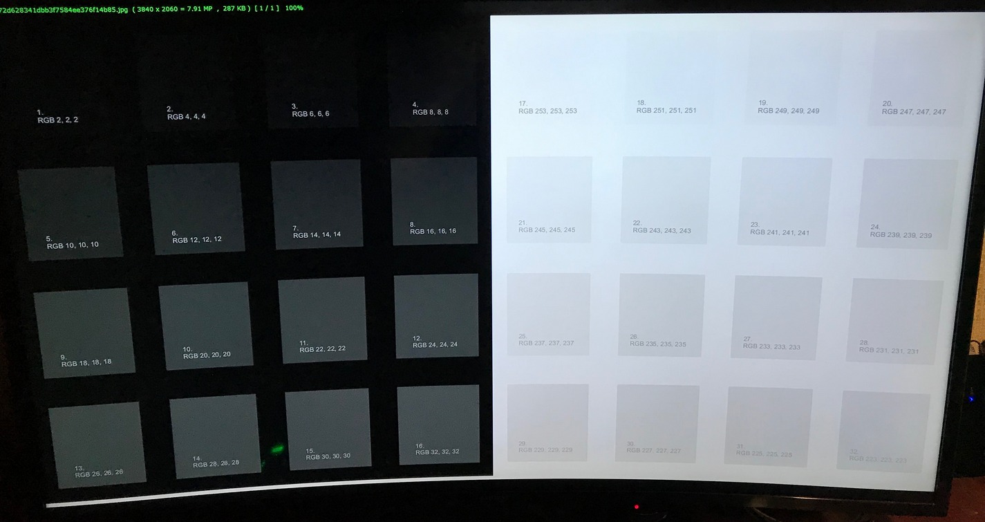 На слово поверишь? Чего мне врать то. Я вижу все квадратики, но когда фоткаю на телефон, пара чёрных в левом верхнем углу немного сливаются и белые сверху слегка. Фиг знает, как сфотографировать, чтобы все было видно... К тому же на ТВ-мониторе я всё вижу, а если открываю фотку на iPad, он темнит немного. Короче, умеют ТВ в 0-255. С чего ты взял, что нет.